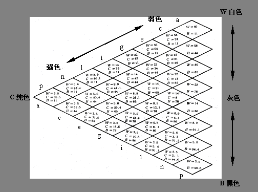 奥斯特瓦尔德等色相三角形奥斯瓦尔德颜色系统共包括24个等色相三角形。每个三角形共分为28个菱形,每个菱形都附以记号,用来表示该色标所含白与黑的量。例如某纯色色标为nc,n是含白量5.6%,c是含黑量44%,则其中所包含的纯色量为: