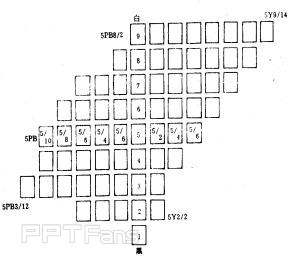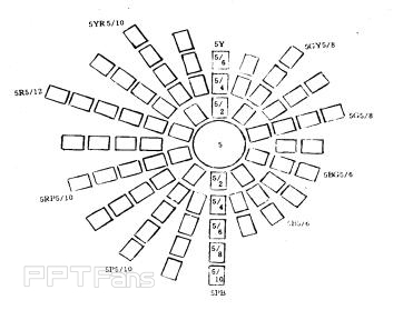 《孟塞尔颜色图册》是以颜色立体的垂直剖面为一页依次列入。整个立体划分成40个垂直剖面,图册共40页,在一页里面包括同一色相的不同明度值、不同彩度的样品。如图5-19所示,是颜色立体5Y和5PB两种色相的垂直剖面。中央轴表示明度值等级1-9,右侧的色相是黄(5Y)。当明度值为9时,黄色的彩度最大,该色的标号为5Y9/14,其它明度值的黄色都达不到这一彩度。中央轴左侧的色相是紫蓝(5PB),当明度值为3时,紫蓝色的彩度最大。该色的标号:5PB3/12。