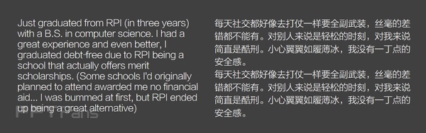 在两张截图中,大家都知道不同的造字方法和字体结构是造成这种阅读体验差别的一个很重要的原因。英文是字母拼接而成,不同英语单词之间给人直观感受就是长度不同,但是像中文这样的方块字,不同字给人的直观感受是笔画的复杂程度不一样。