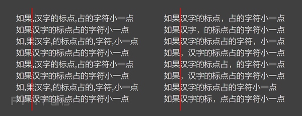 1. 标点符号:汉字在最开始是没有标点的,所以读古人的书都是要自己学习句读的,但是标点引入无疑使得人们阅读更加方便,我们的数字输入中,标点都是占一个字符的,汉字的字符长度比单个的英文字母长度明显长很多,所以在标点处,会感觉到间隙上的相比较而言的不协调。但是如果把标点所占字符改小的话,就会出现下面的对比情况(左边用的英文标点,所占字符小些),我们发现右边字在列上对齐的视觉效果要好些,所以我们的输入法有两套标点符号,大家使用时也要注意区分: