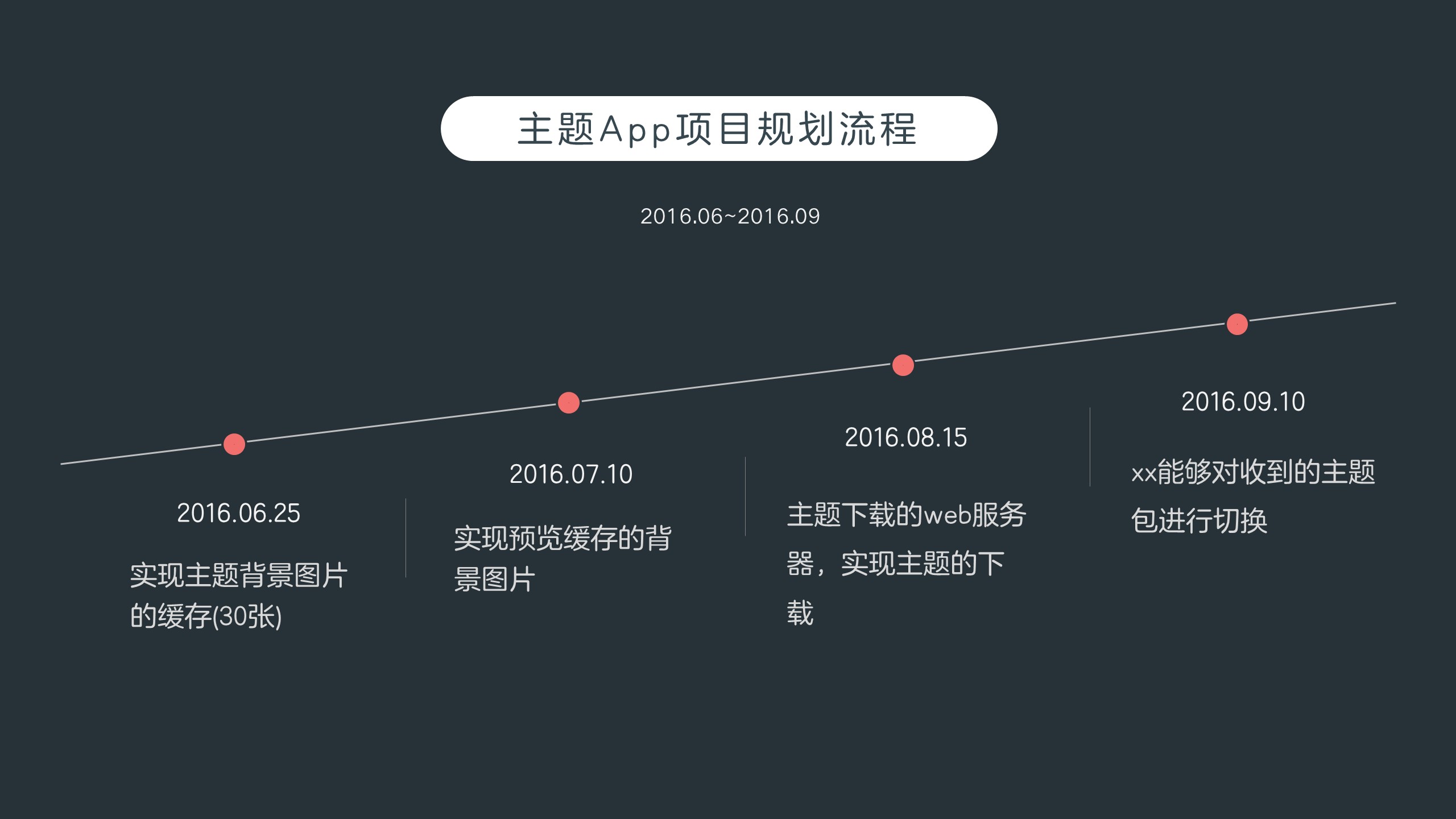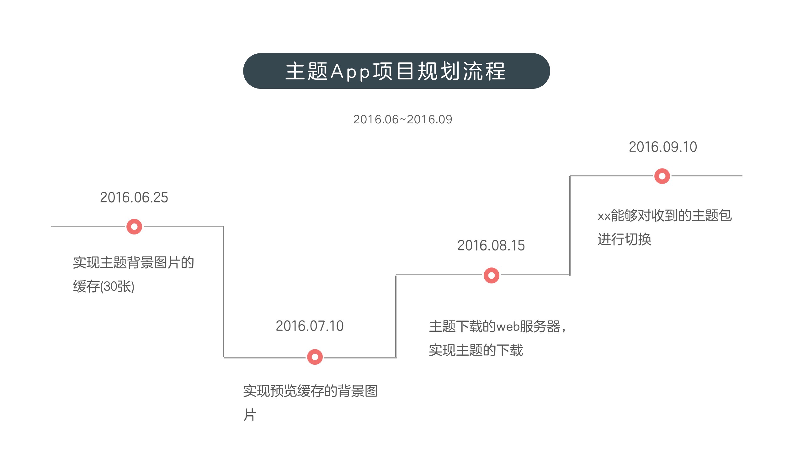 上图中,使用倾斜直线作为时间主轴线,流程主要包括四个时间节点,用圆点等横距分布,加上每个节点对应的时间和文字信息,如果能力允许,可以使用过程显示动画,使得观众更易接受每个节点的信息展示。