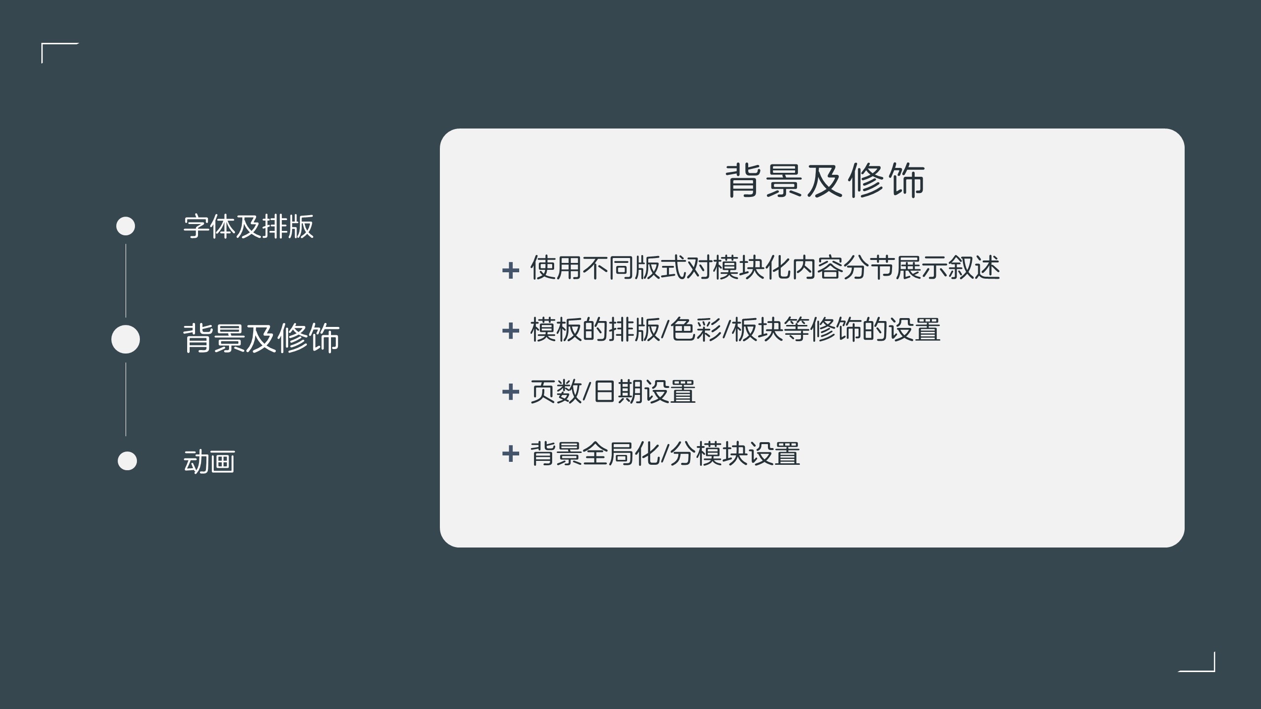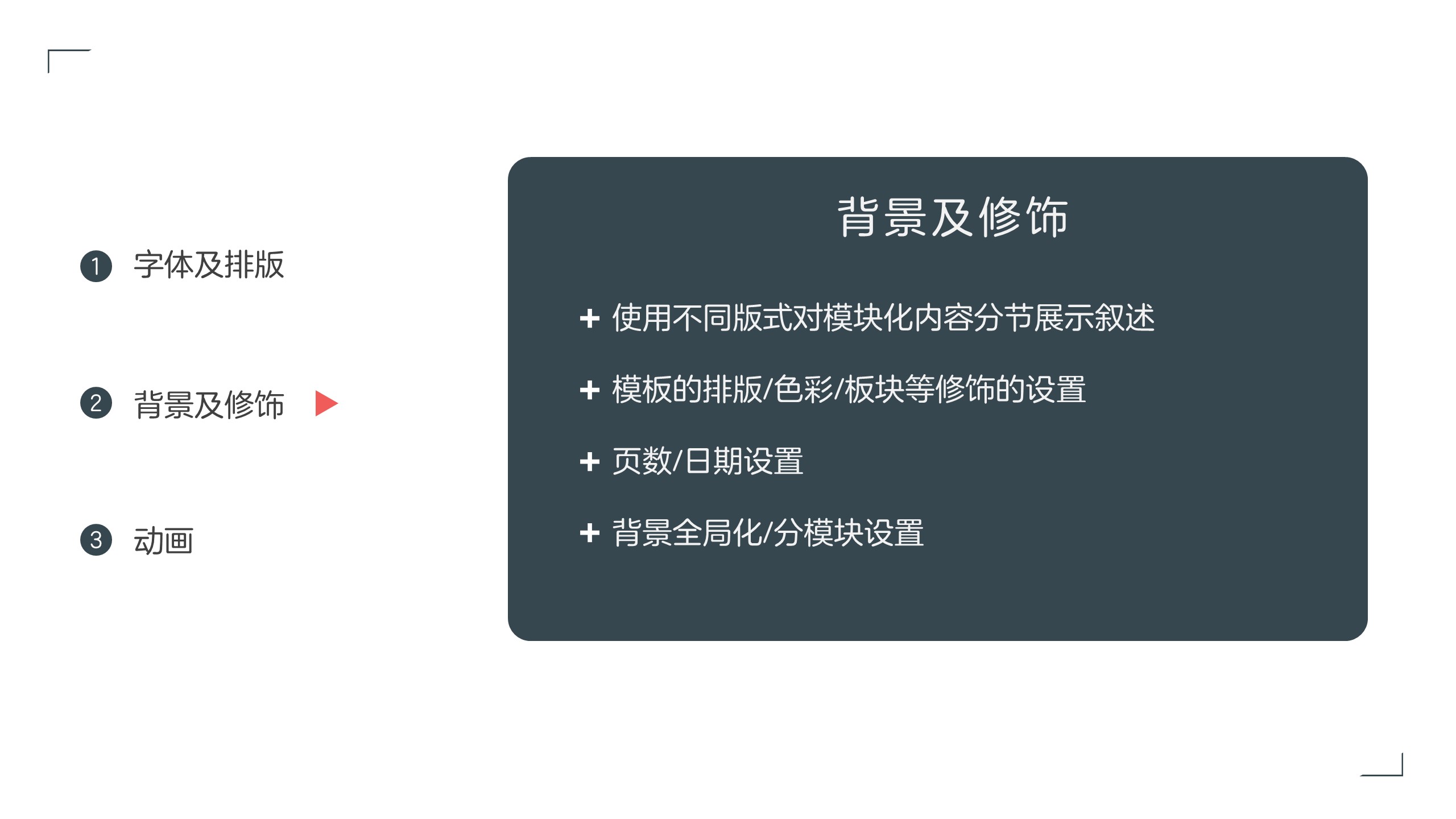 在幻灯片制作中,会遇到许多同质内容的展示,观众可不想去猜测这种页面展示了几张还有几张,于是加入这种页码显示的标识,一定程度让观众心里不会太排斥。