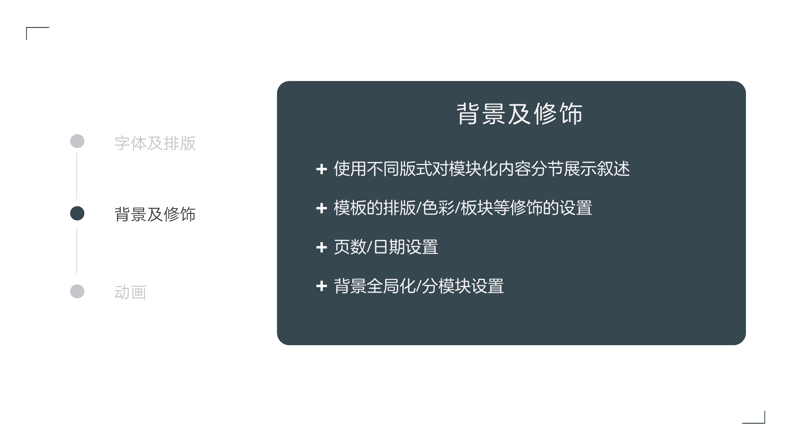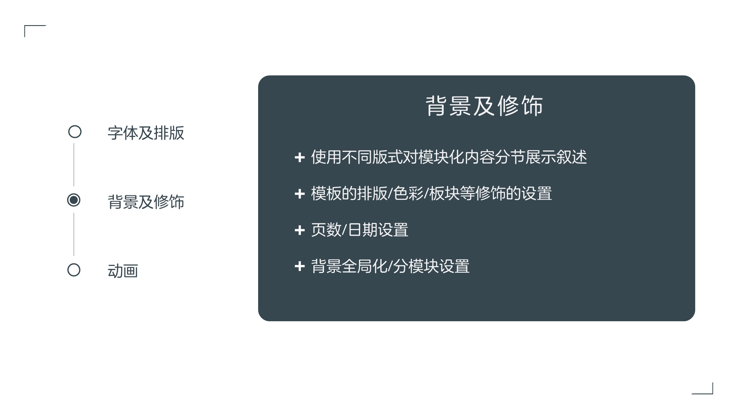 不同于前面均是水平主轴线,此处使用纵向轴线。两种轴线的区别不大,只要表达内容的脉络清晰就可。