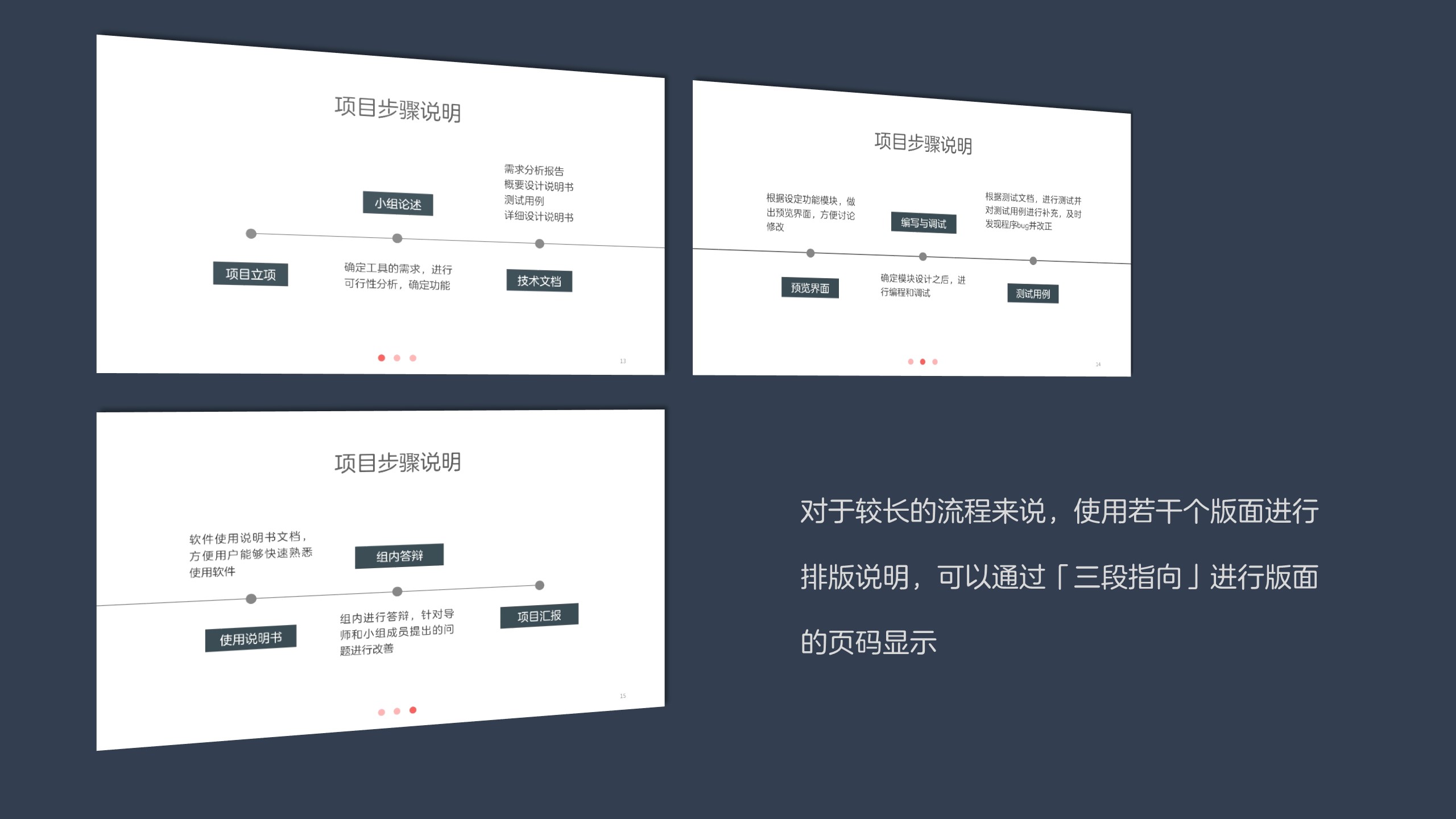 3.3.1 长流程对于节点过多的事件/时间流程,可以使用左右切换的方式用于流程的徐徐展开,另外使用三段指向的页码标识来给相应的每个界面做标示。