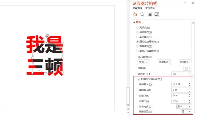 在文本填充中选择进行图片填充,接着添加相应的图片即可。三顿这里还给文字加了灰色的轮廓,大家也可以自由发挥。