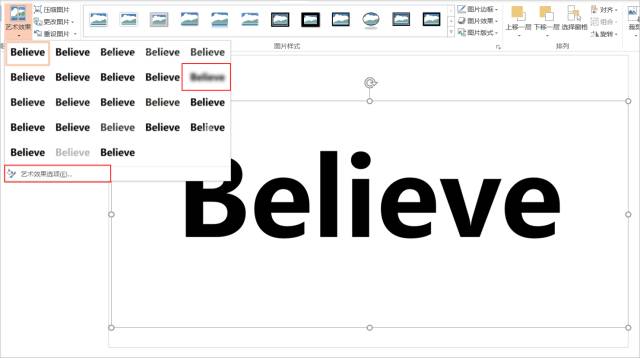 接下来选中图片,在格式选项卡找到图片中的图片效果,选择模糊效果。在下方的艺术效果选项中还可以调整模糊效果的数值。