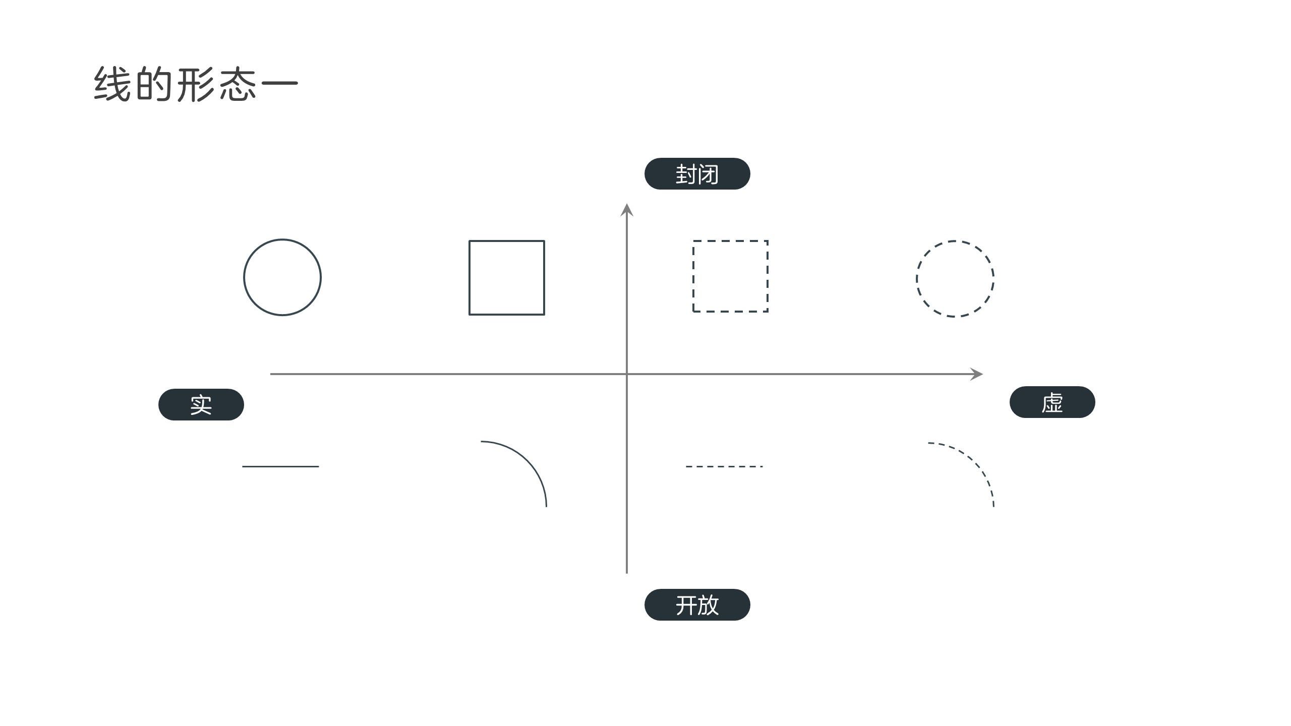 从线条的实与虚,开放与封闭的角度上来看,线条的种类众多。且根据指向性来划分,还有无箭头和有箭头之分。怎么样去使用这些线条,下面的篇幅将简要做个说明。