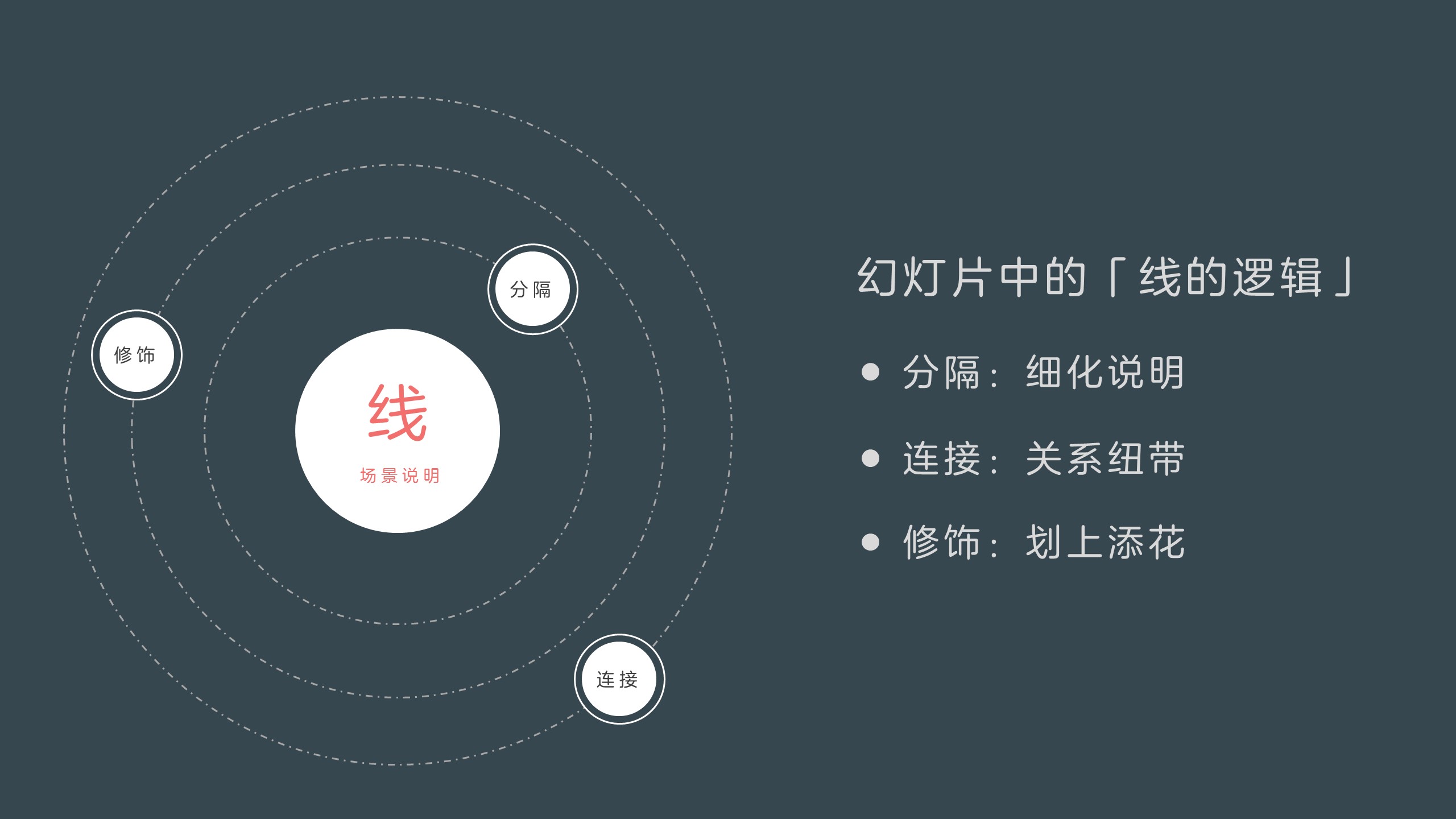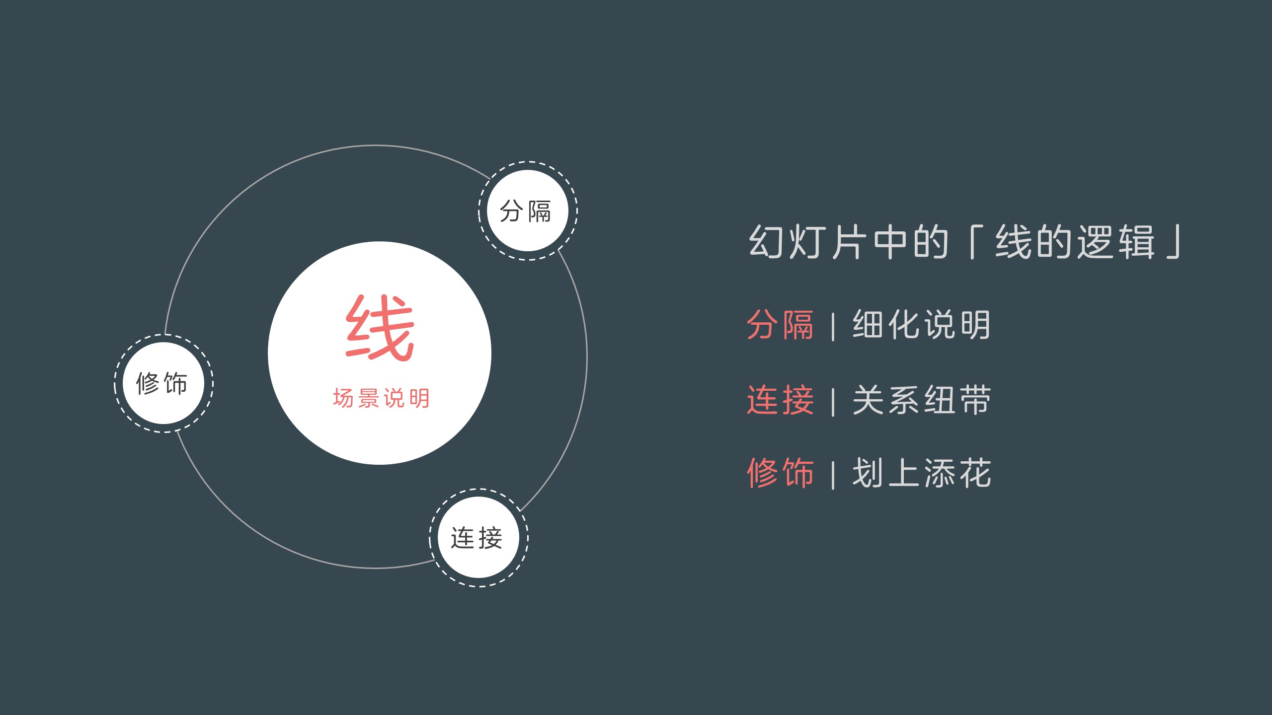 幻灯片中的线,按照使用场景,分为:连接、分隔、修饰三种。