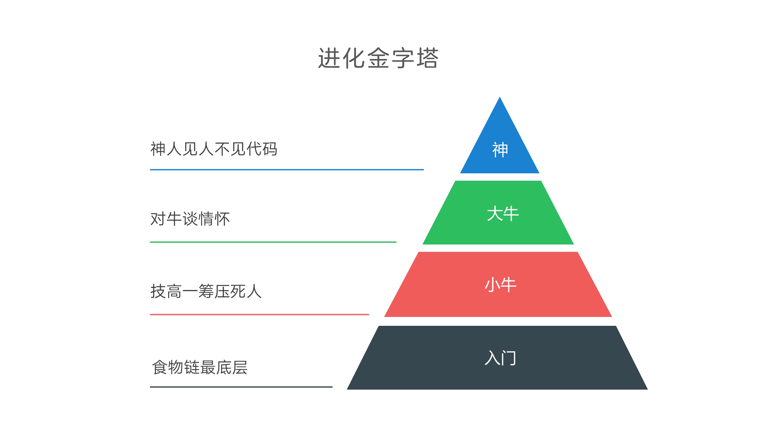 这种三角的金字塔结构,右侧用于填充内容作为层级显示,左侧通过线条指示,对每个层级进行详细说明。使用层级结构的内容论述时,可以使用这种使用场景。