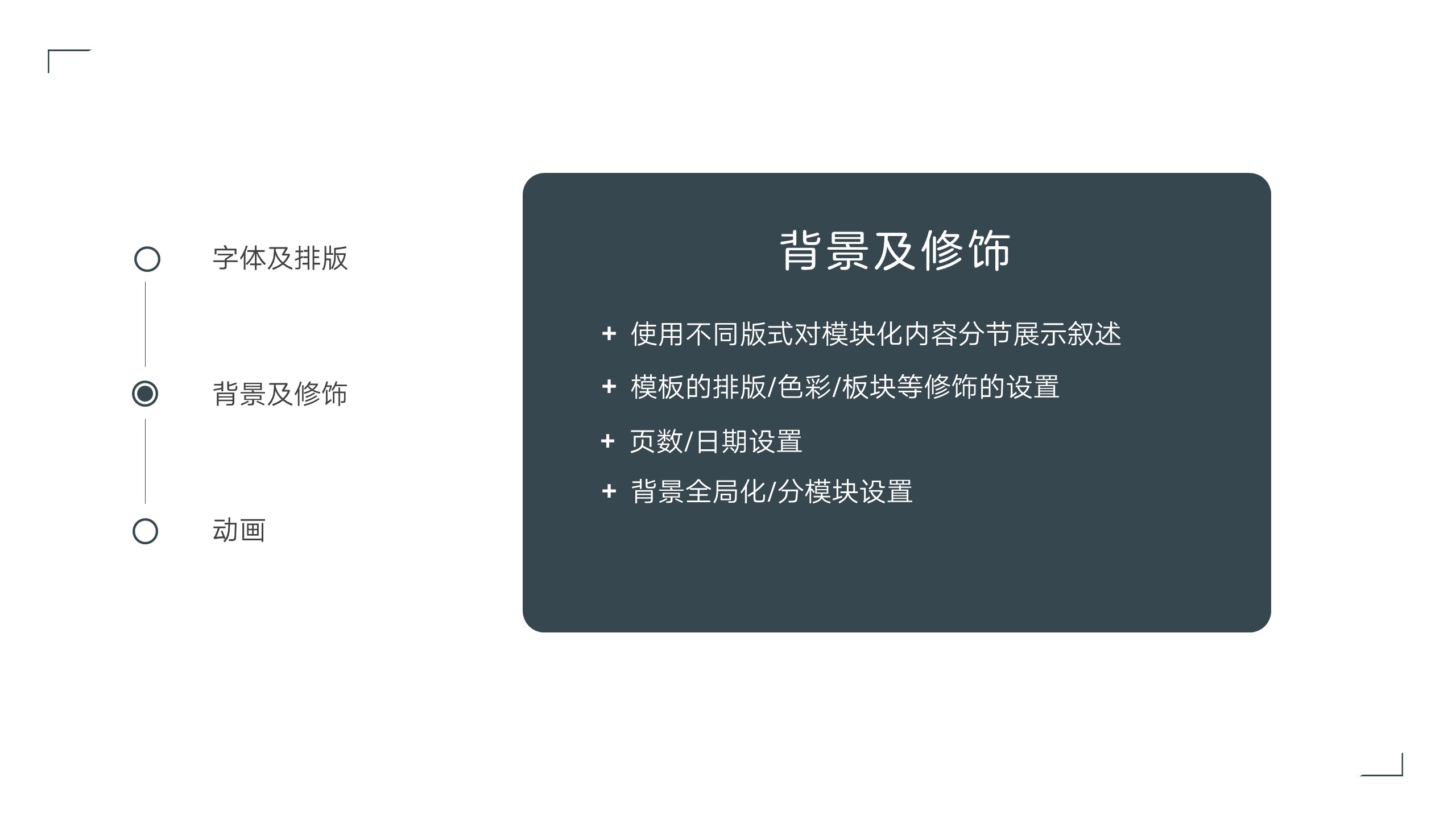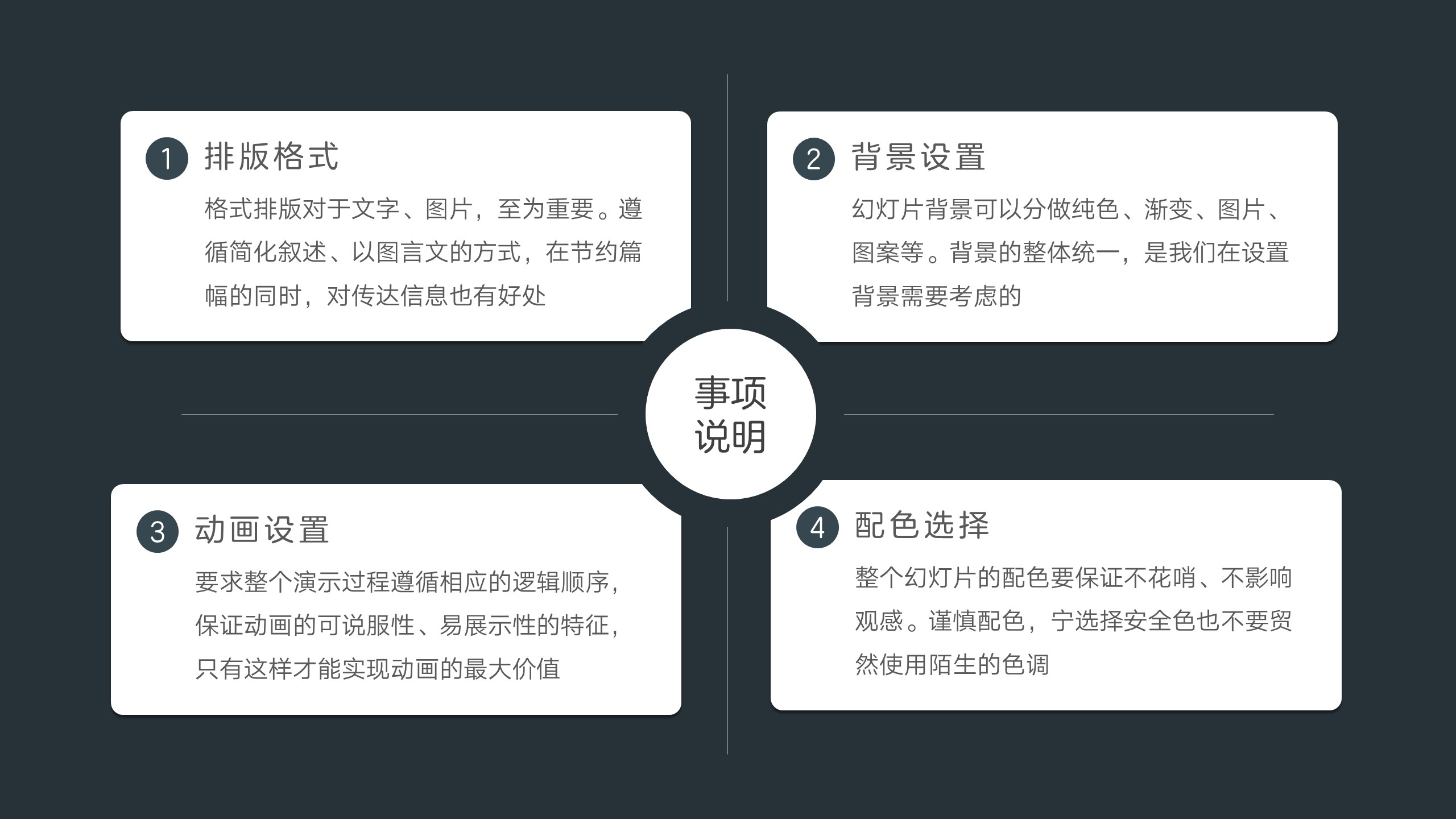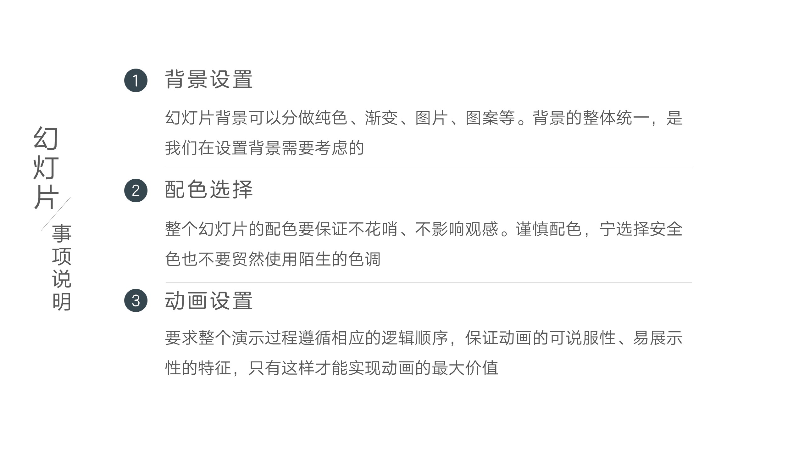 顾名思义,分隔的意义在于划分文字板块、色块、图片等演示文稿展示元素,能够使得各个元素各自细化进而说明。连接是作为各个元素之间连接的关系纽带,尤其在流程说明中由于其各个流程之间的指向作用,线条的连接作用显得至为重要。修饰,只是通过线条的扁平延伸的作用,使得页面看起来更加舒服和突出要点。