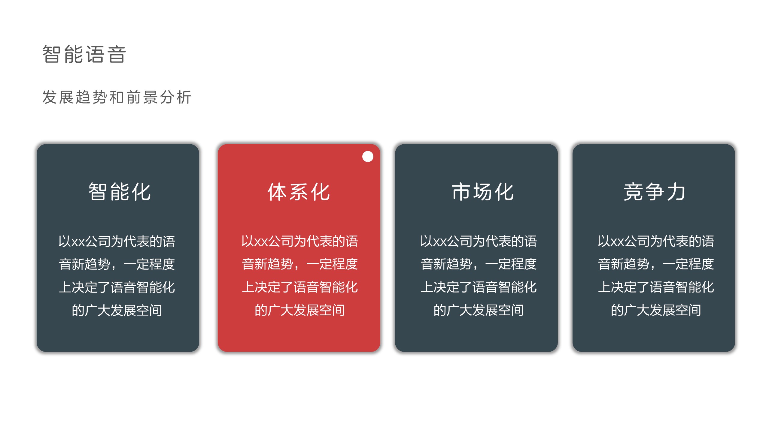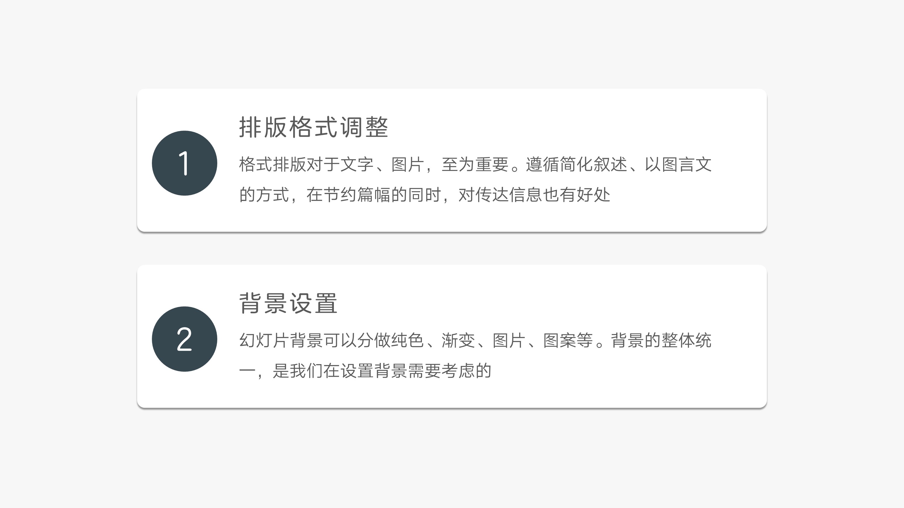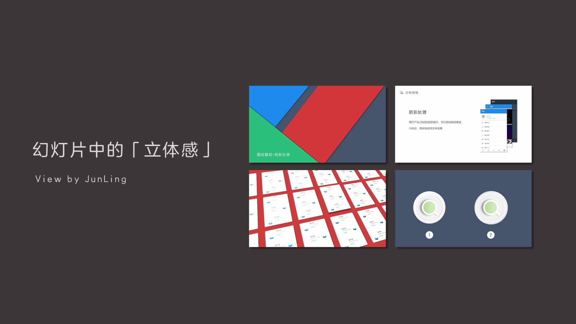 使用阴影处理,这种卡片式内容排版,对其进行阴影处理,强化卡片和卡片的边缘空间距离,使得单个卡片块能够传递独立的信息。Android的界面设计规范中,Material Design内容展示使用大量的卡片。相比于列表展示分隔线,卡片的虚化边缘分隔在视觉上更舒服。当然在幻灯片制作排版,可以适量使用这种阴影式的卡片排版,为页面添彩。