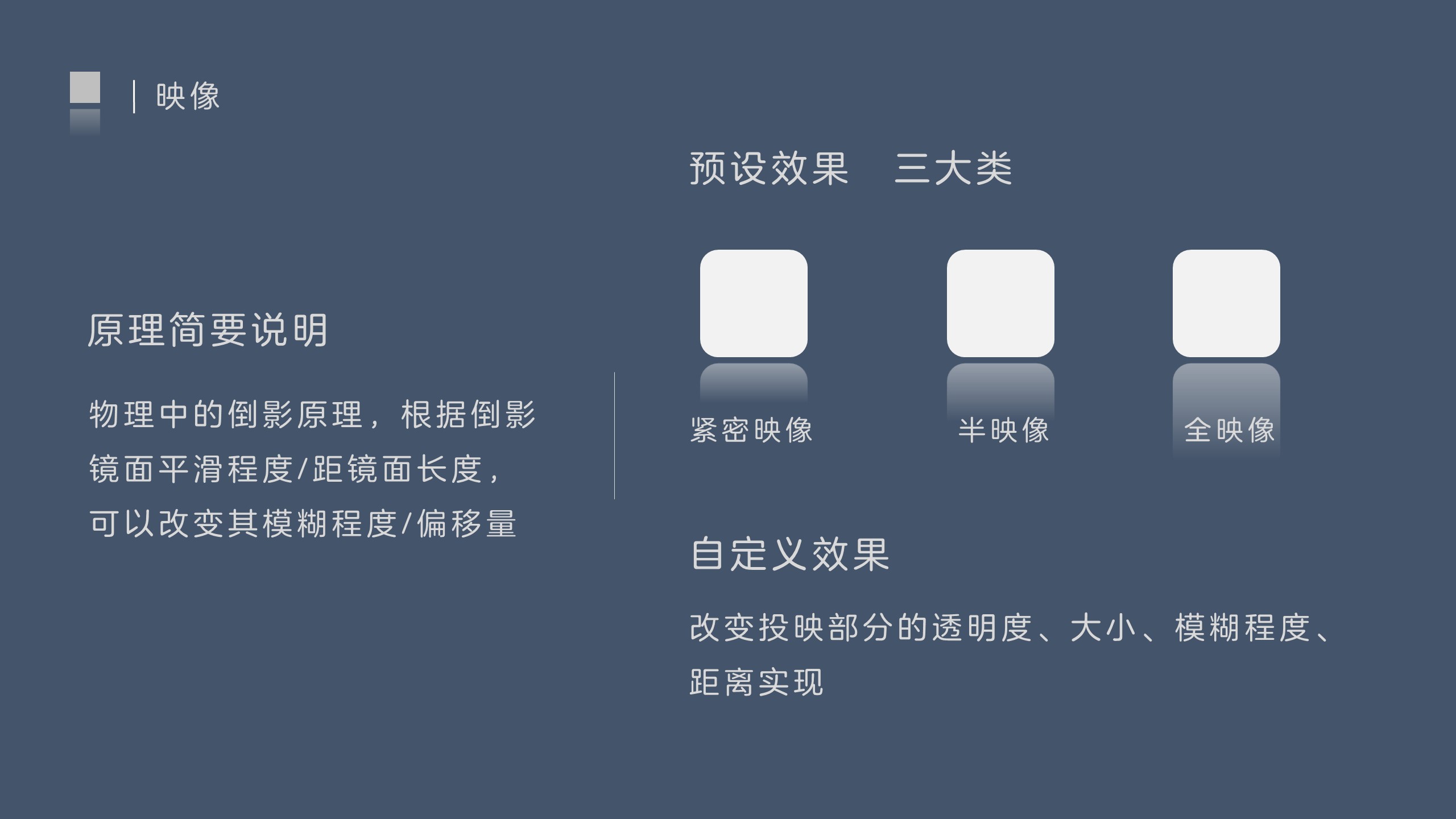 映像效果,遵循物理中的镜像原理,根据镜面平滑程度/距离镜面长度,可以改变映像而生的模糊程度/偏移量。