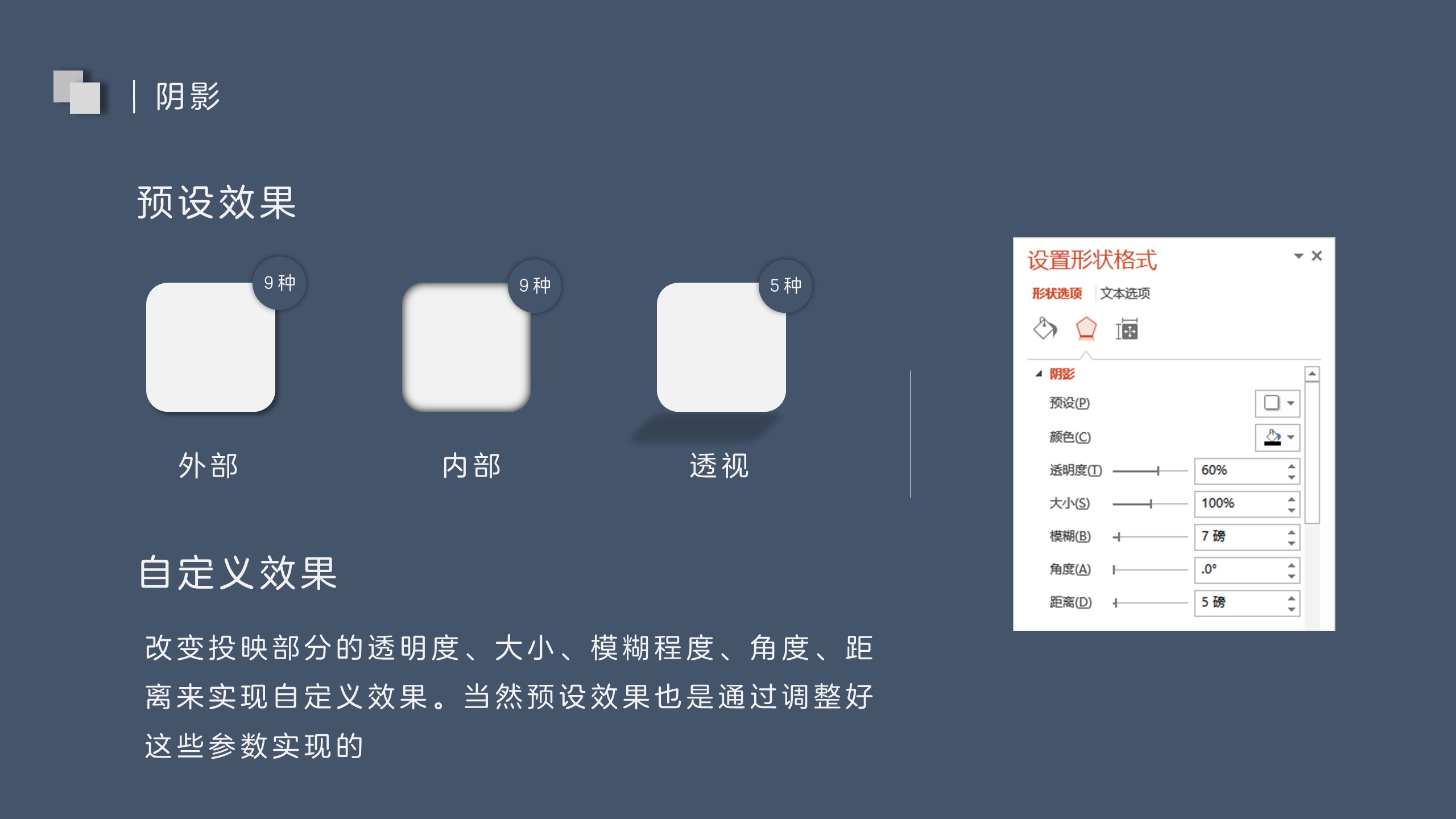 阴影效果选项中,预设的效果包括外部、内部、透视三种。其中每一大类之中又包括了几个小类。如果这些预设的效果不能够满足实际需求,可以自定义阴影效果。主要是改变投映部分的透明度、大小、模糊程度、投映角度、距离这五个参数进行设置。可以说,预设效果也是通过这五个参数按照一定设置而实现的。