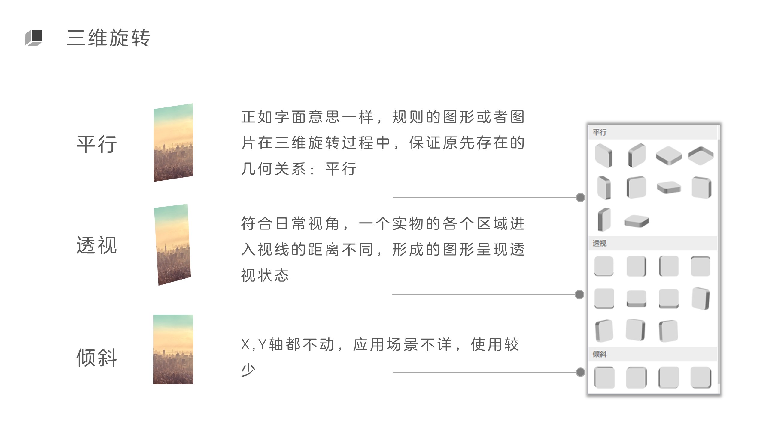 包括平行、透视和倾斜三种,其中前两者使用较多,第三种效果应用较少。在平行和透视之中,透视能够体现一个实物在三维空间中的各个观察视角所得,而不像平行那样只能从固定视角去观察。