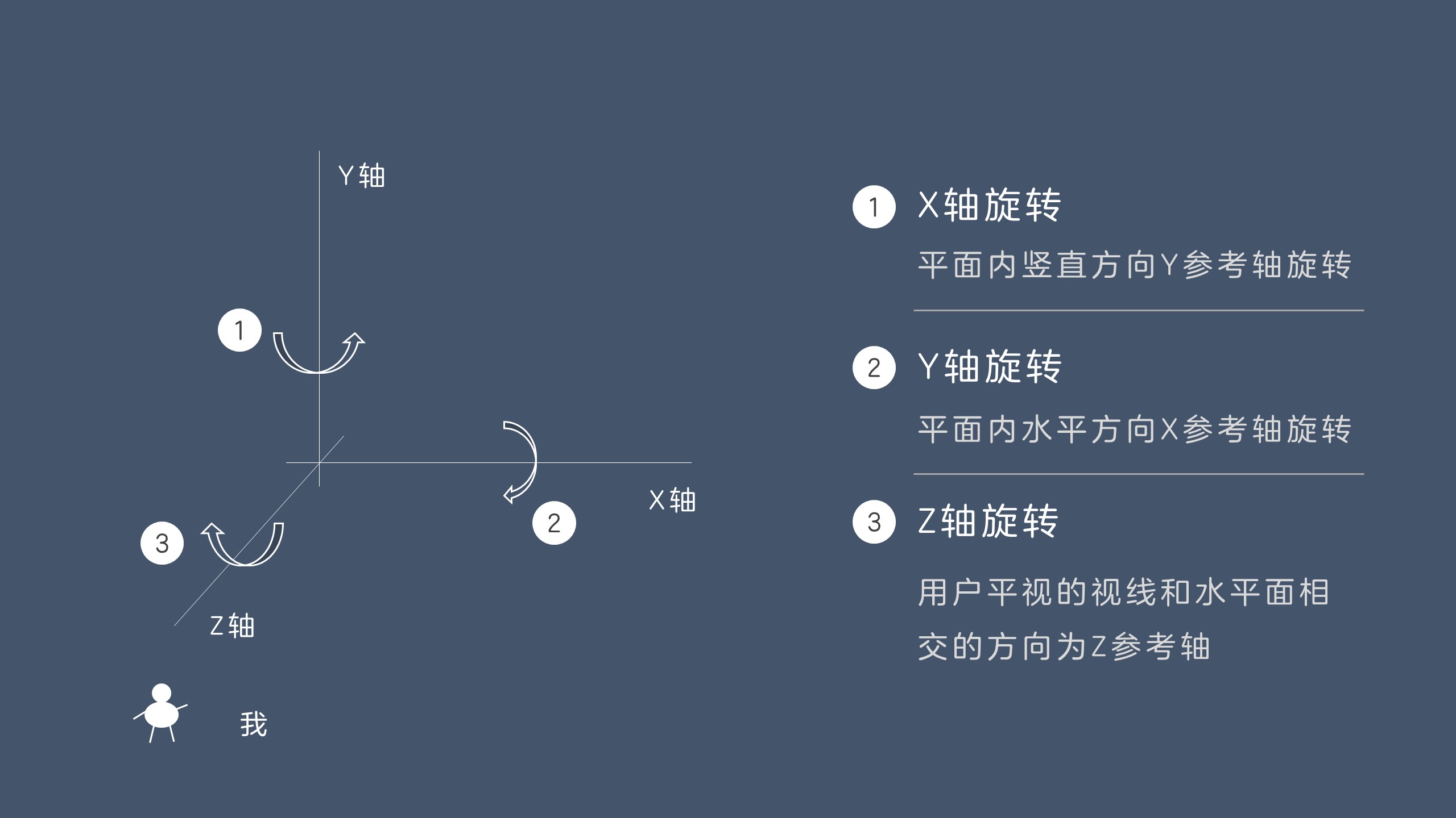三维旋转,以XYZ三个坐标参考轴进行旋转,使得直观体现三维的视觉效果。下图中是一个空间示意图,其中Z轴旋转需要说明的是,它参考的旋转轴是用户平视XY平面的垂直视线。