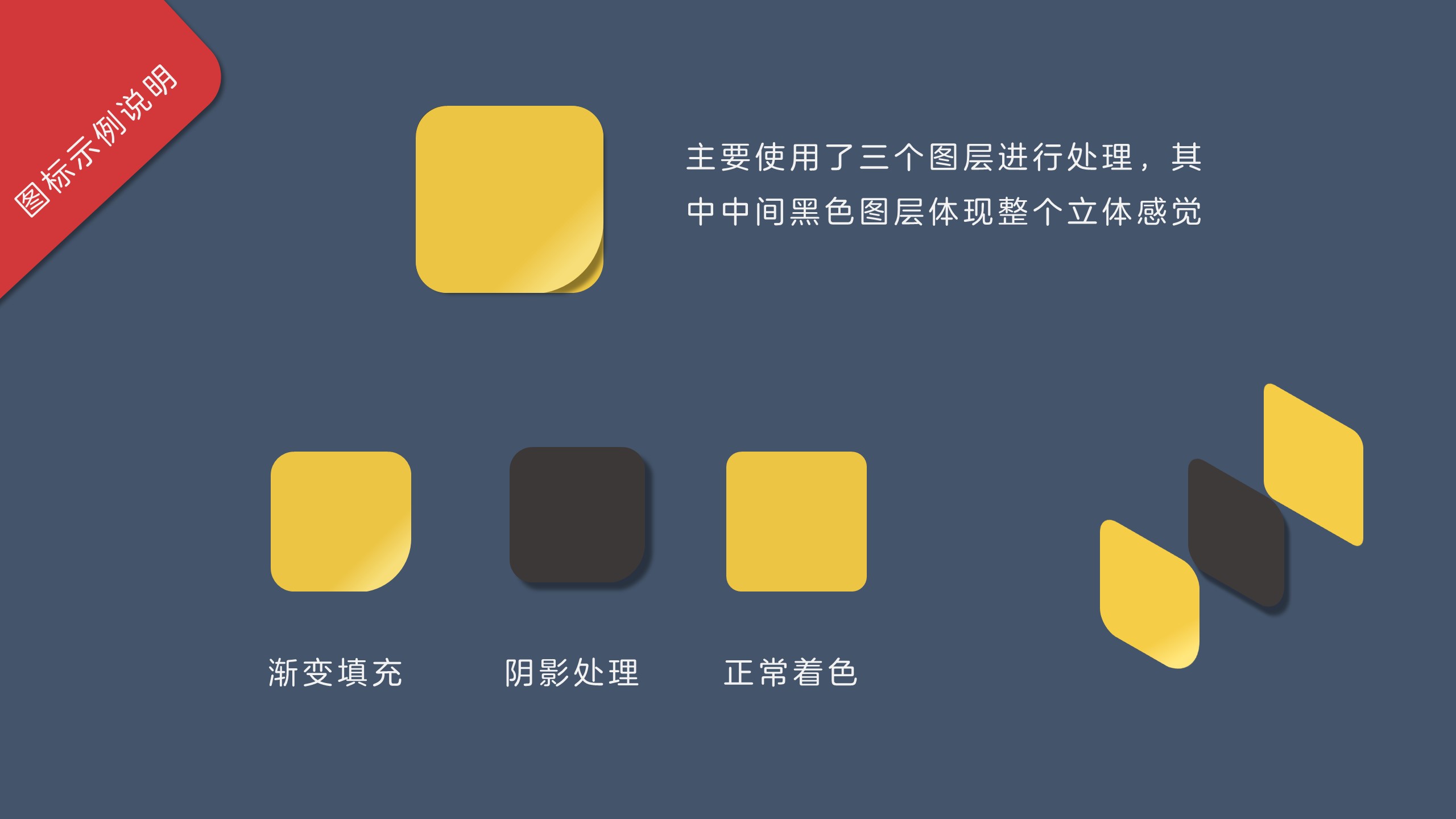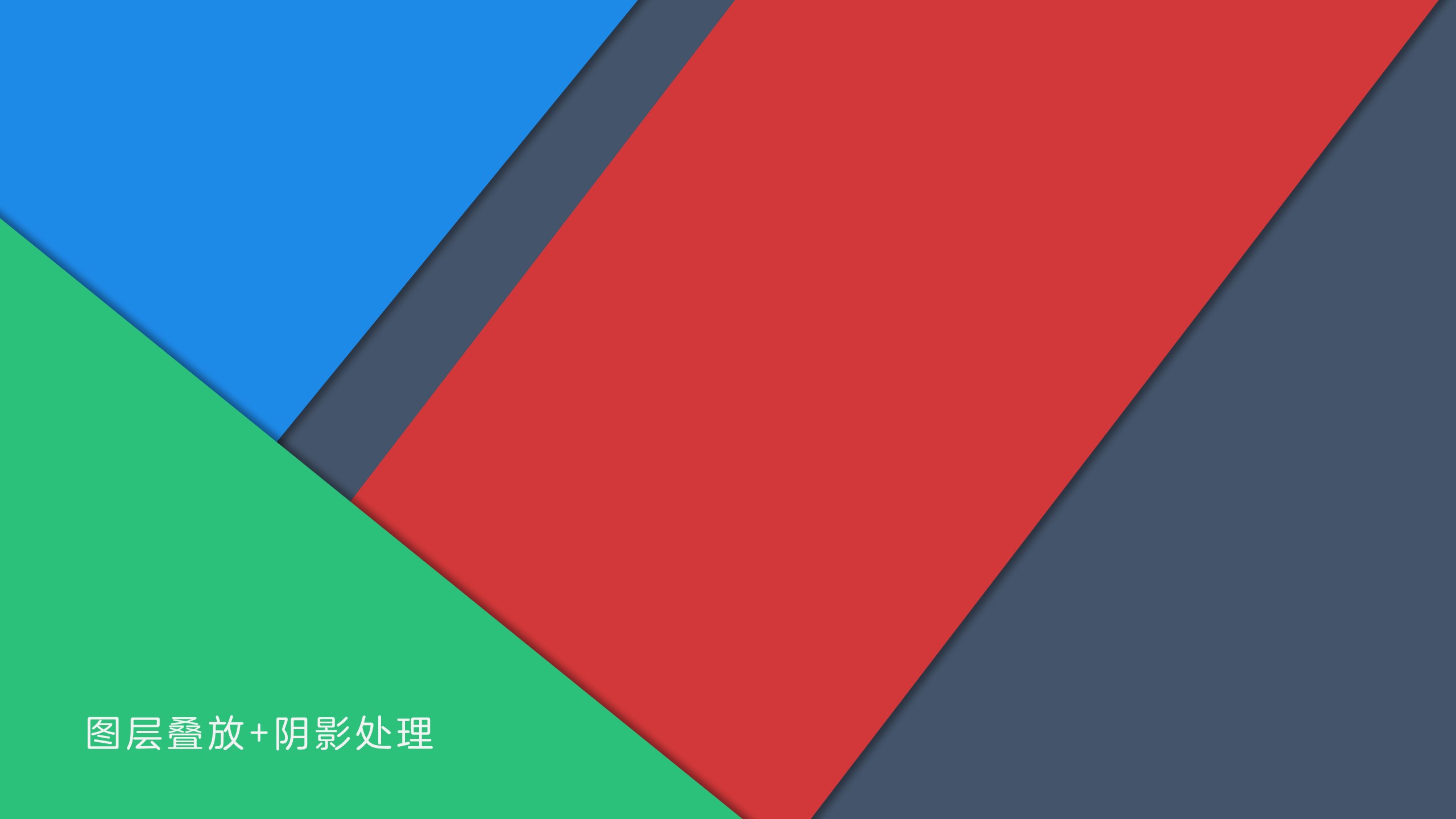 多个不同颜色的图层叠放,每个图层均使用阴影处理。具体使用场景,作为演示类幻灯片,加入适量动画处理,作为封面或者过渡页装饰。