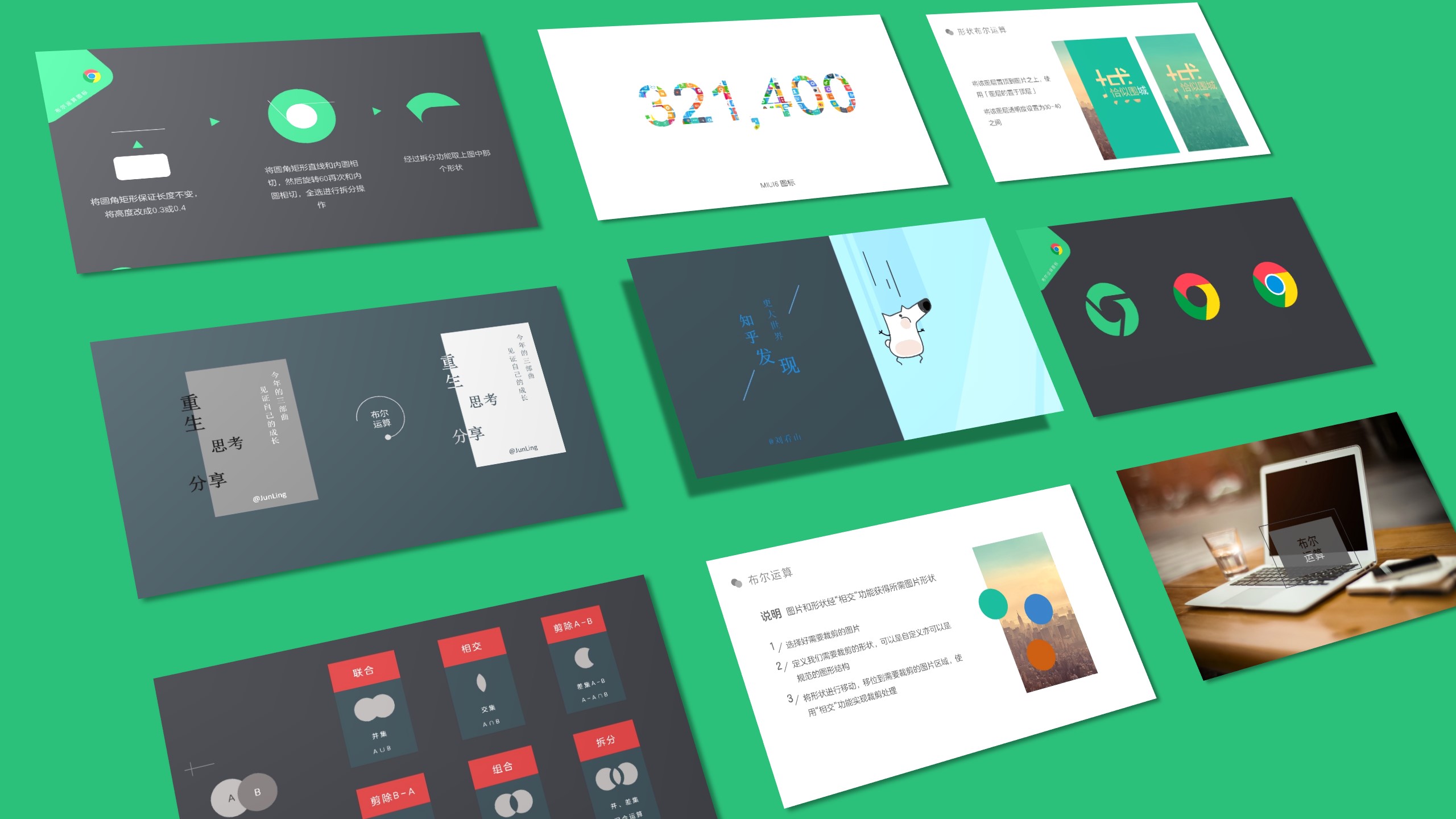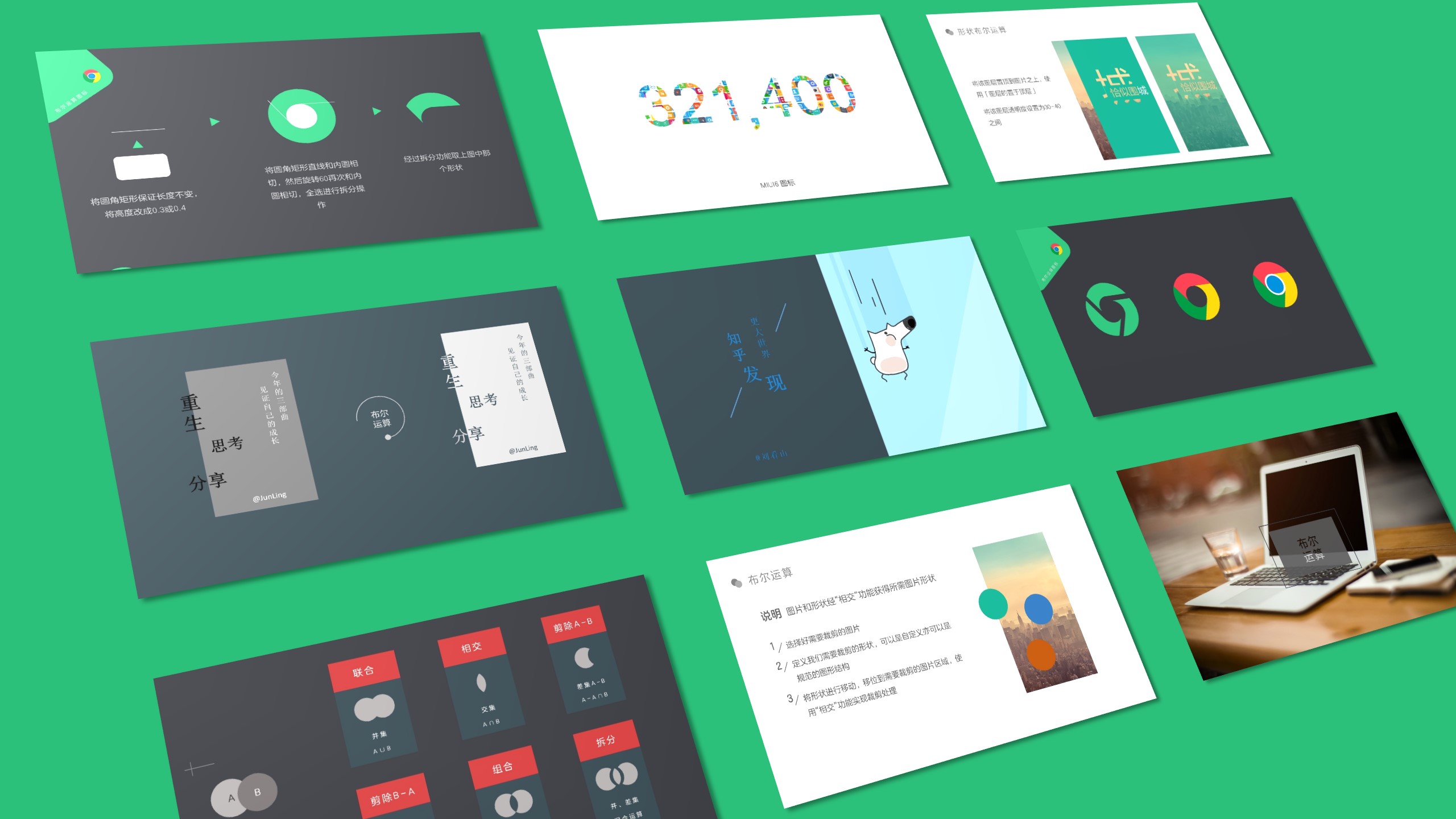 在我们日常接触过程之中,会碰到许多基于三维旋转制作的封面或展示图,正如下图所示:对每个图形进行阴影处理,然后进行三维旋转的透视处理。