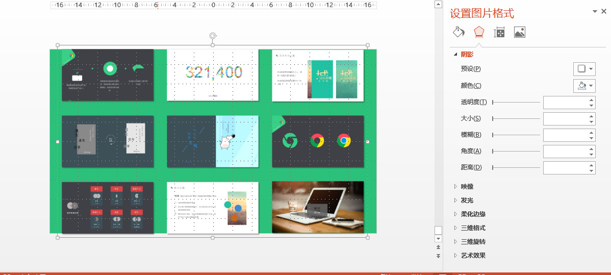 step1:排列好一组图片,保证间距一样。全选图片,然后右键进入设置图片格式,选中一个阴影效果。鼠标右键:组合,将其合并成一个整体,但仍然保持每一个个体的独立。