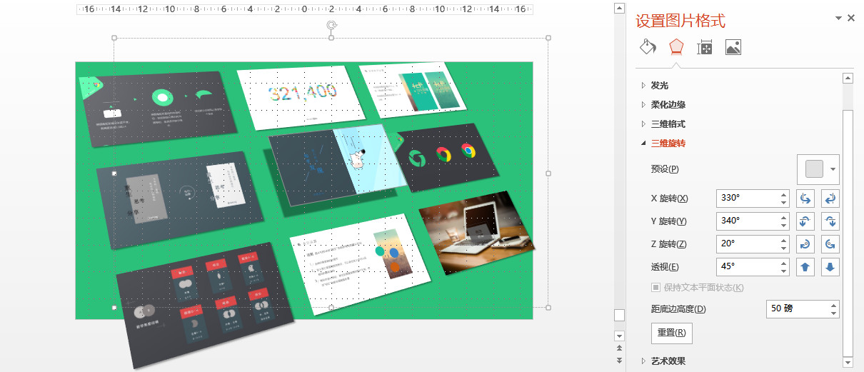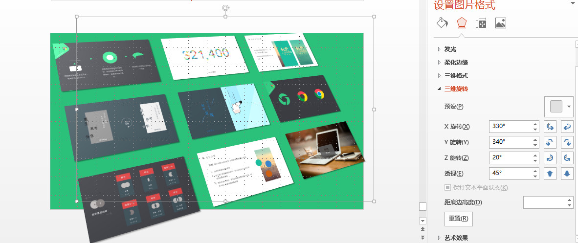 2 选择三维旋转中透视效果,调整到合适,后右键:取消组合。找相同的几张照片,使用格式刷或ctrl+shift+c/v,将其他几张图均刷成一样的格式。