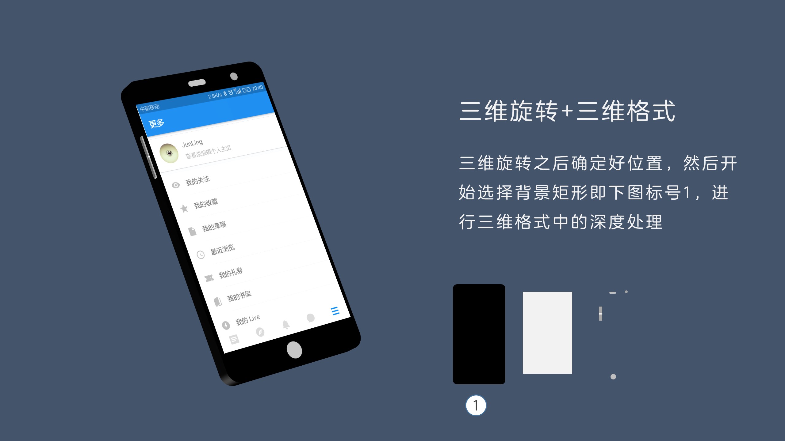 当然三维旋转玩法很多,这里就说明一个。使用手机几何模型+界面,这里的手机模型是基本的几何图形组合,因此不具有厚度这个参数。
