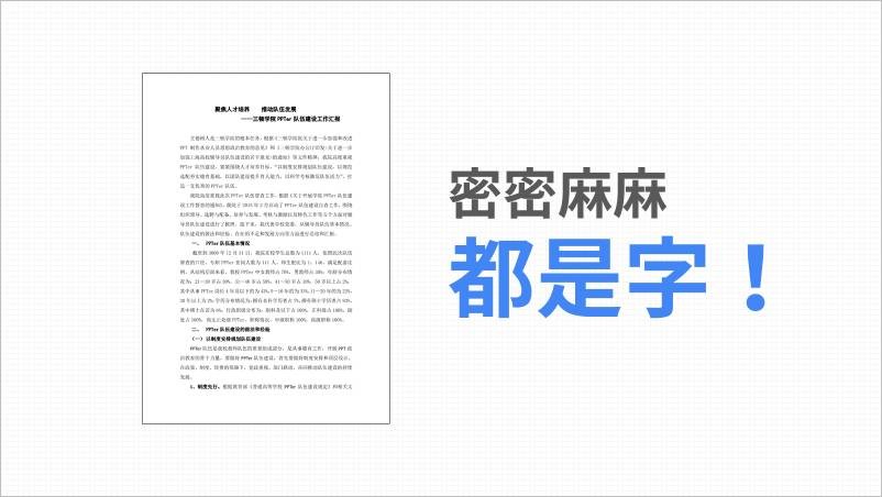 相信大家都遇到过这样的情况,领导甩给你一份密密麻麻都是字的文档让你做成PPT,并且告诉你,一个字都不许删!