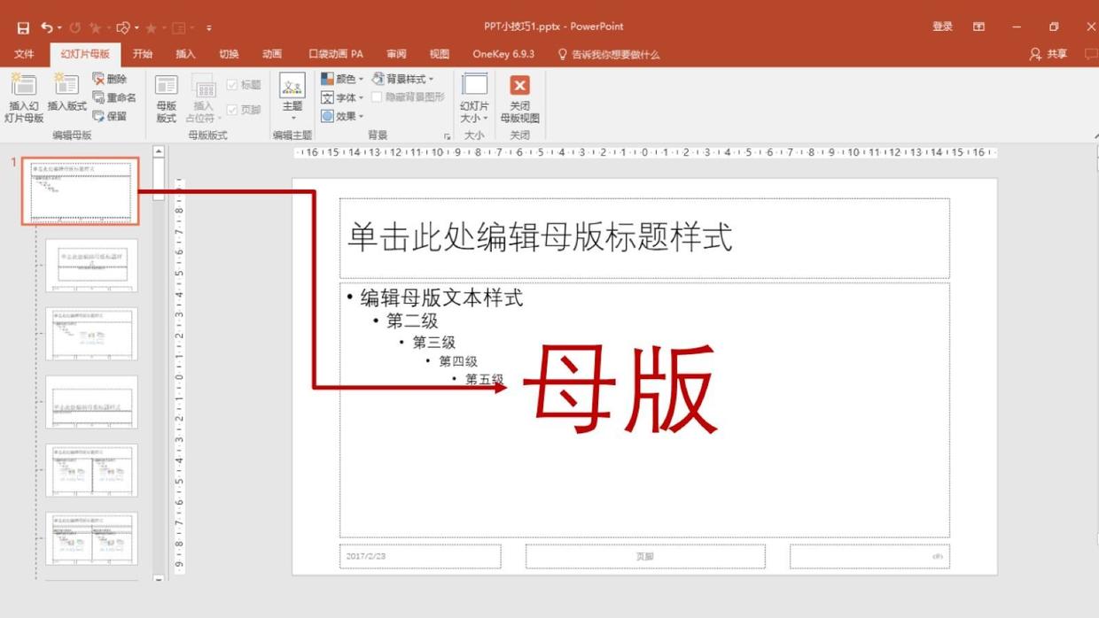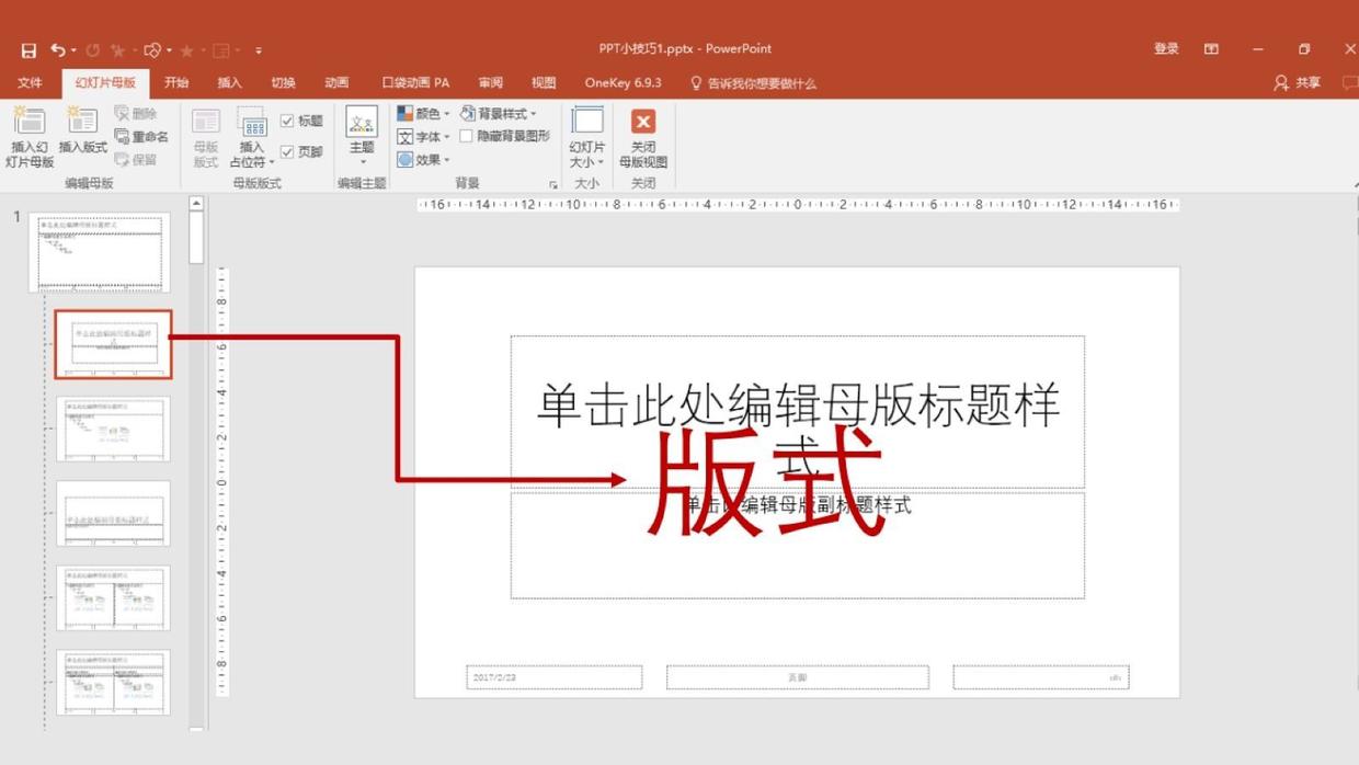 下面那些小的,就是:版式。打个比喻,这个大的母版就是这个系列模板的姓,下面的小的版式就是母版的孩子。在母版上,修改任何的内容,在版式上都会跟着变化。