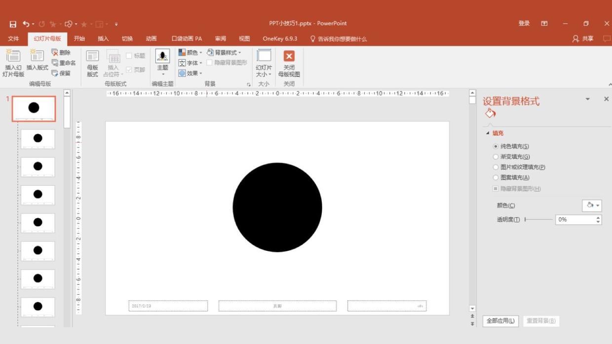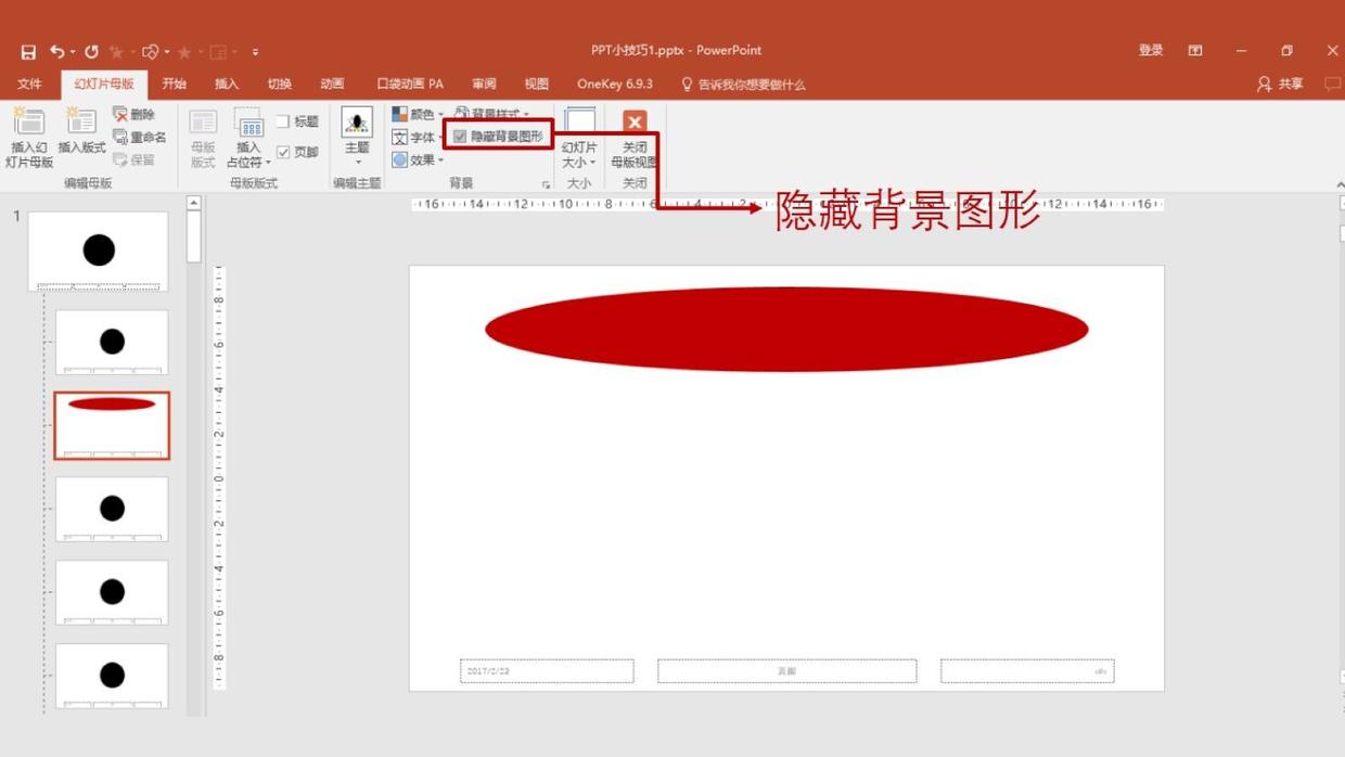 在版式的页面中,我们是不能编辑和删除这个圆形;如果我们想要某个页面和母版不同,该如何操作呢?我们只需要在母版视图下,在背景选项卡中勾选隐藏背景图形即可。