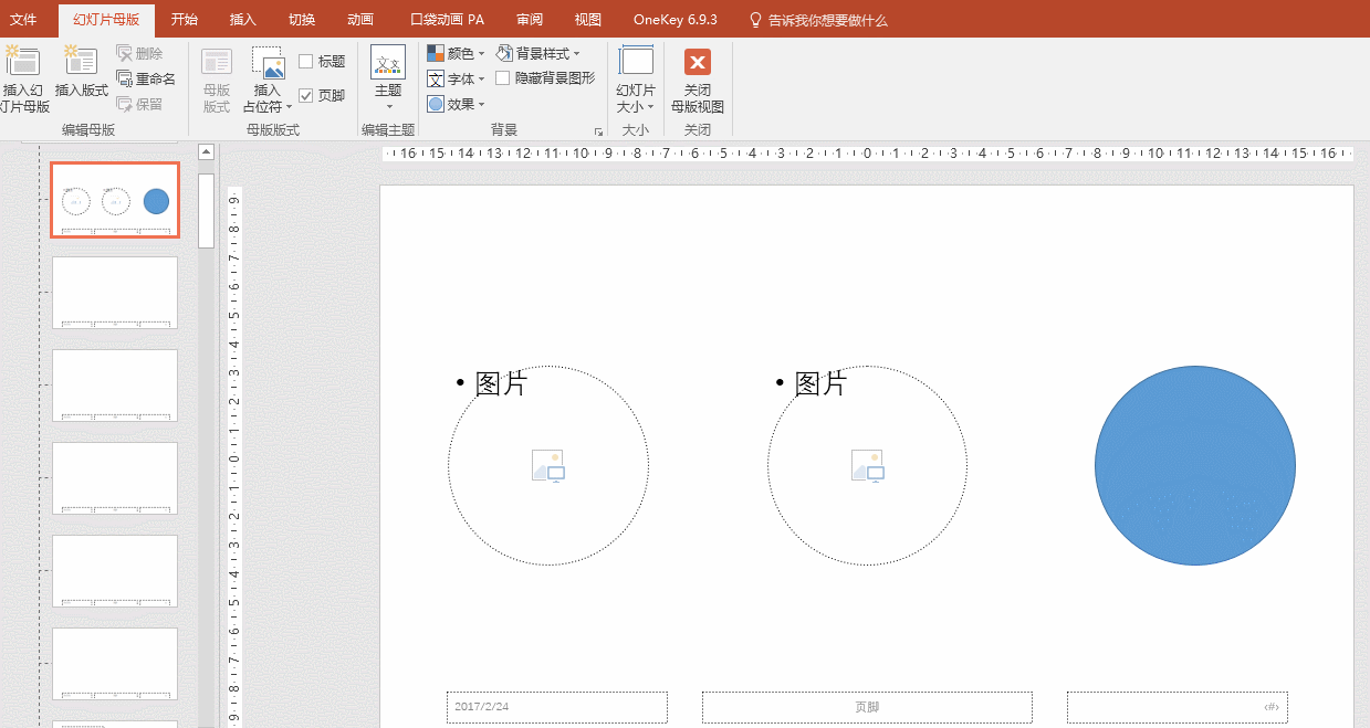 比如我们在母版中插入一个圆形,那么所有的版式页面的相同的位置都会出现这个形状。而且在版式页面里是没法选中这个圆形的,也就是说,我们只能在母版里面进行编辑。