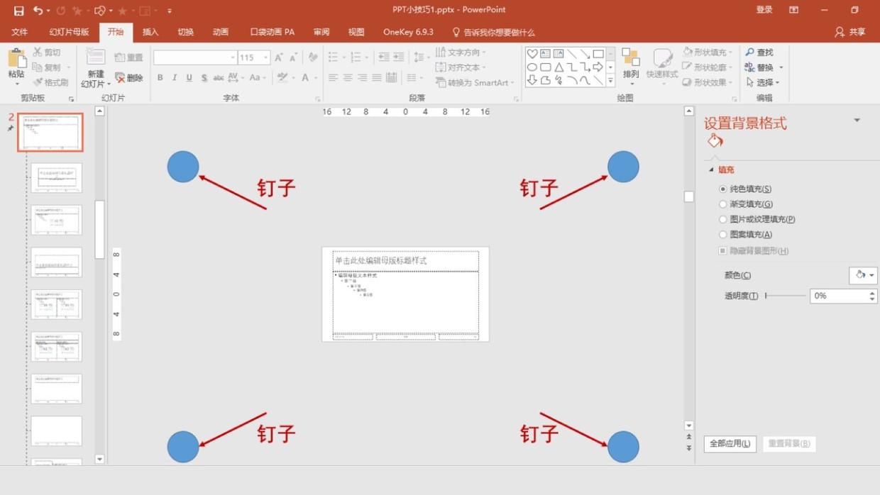 操作其实很简单,将编辑区域缩小,在PPT页面外的灰色区域,放置四个圆形即可。这里为什么推荐大家在幻灯片母版中放置四个“钉子”呢?因为在母版中操作,下面的版式就会自动添加“钉子”,省去了我们一页一页添加的麻烦,而且在母版中操作,我们在普通视图中是不会被删除的。