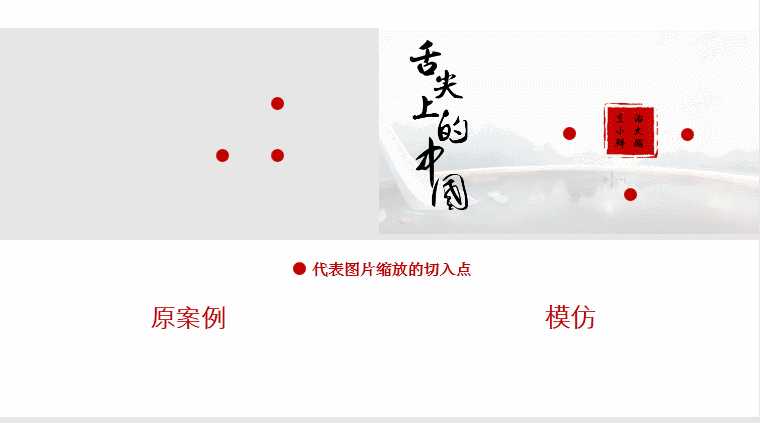 仔细观察,我们可以发现,模仿的作品和原案例的动画效果是有差距的!你能看出来不同的地方吗(请忽略我GIF录制上的差距)?虽然使用了相同的动画效果,但是图片缩放时的切入点是不同的!下面来看下两个GIF图的对比。