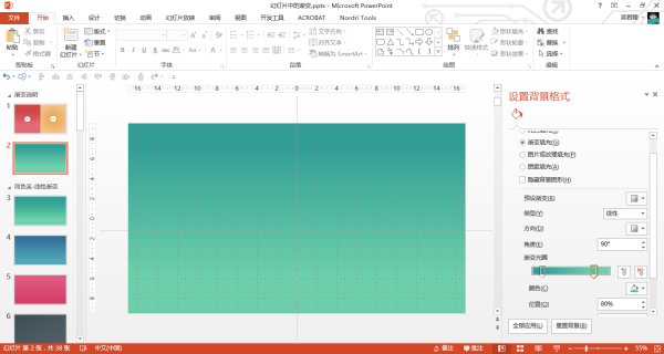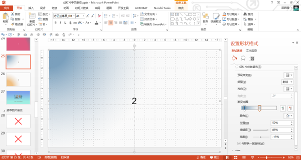 PowerPoint组件中的渐变是可设置透明的,因此对于同色系颜色渐变的时候,可以设置不同的透明度来实现同色系中不同颜色。如果是不同色调渐变的时候这种方法就没那么好用了,但是也是可以用来细微调整颜色的深浅,达到自己预想中的效果。