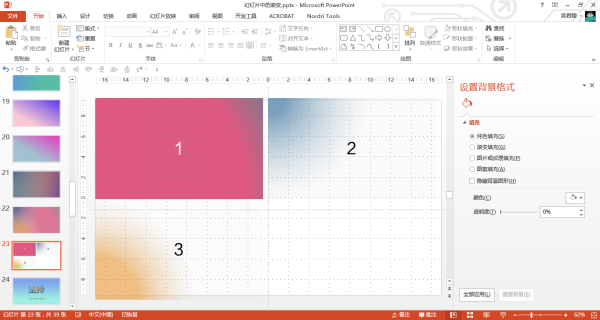 渐变的背景设置在色彩的选择上更加慎重,相较于纯色背景的单一色调。渐变的色彩种类两种或者两者以上。颜色处理较好的话,会给幻灯片的展示增加张力;如果处理不佳,将会造成整个版面设计的失衡。