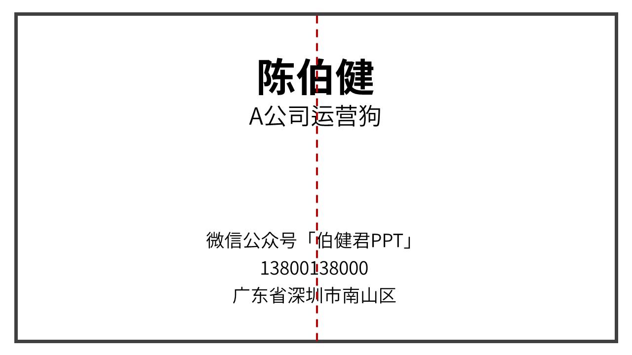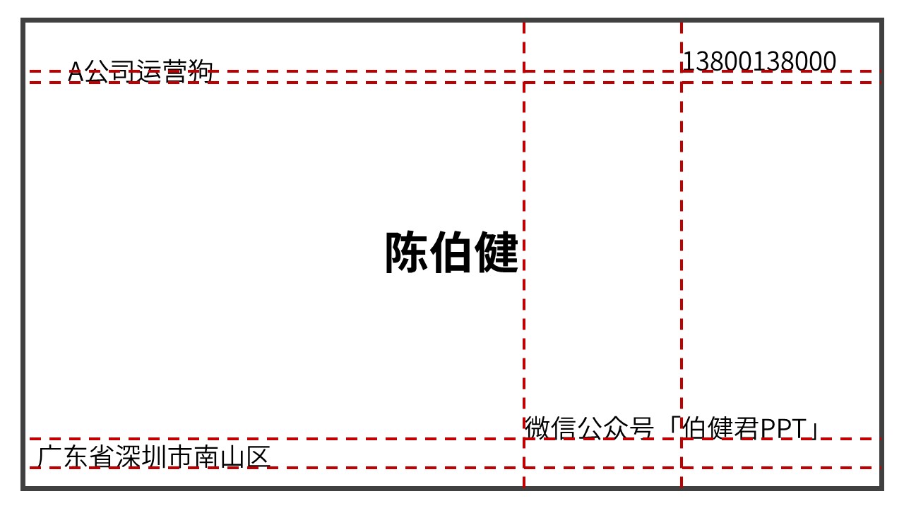 我们发现没有一条辅助线是重合的,这真是太糟糕了,连我都想手撕自己的这张名片了!如果给你改,你会怎么改?其实吧,我们只要稍加对齐,这张名片就会脱胎换骨。?对齐大法第一招:左对齐