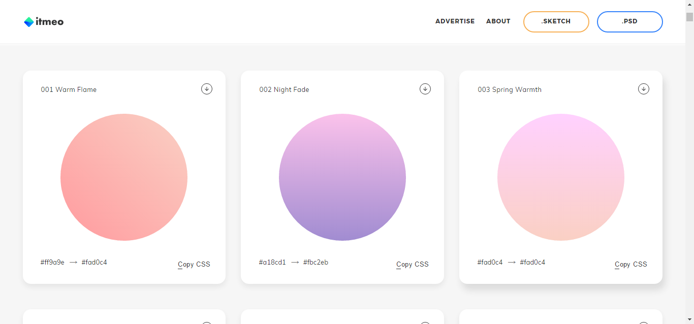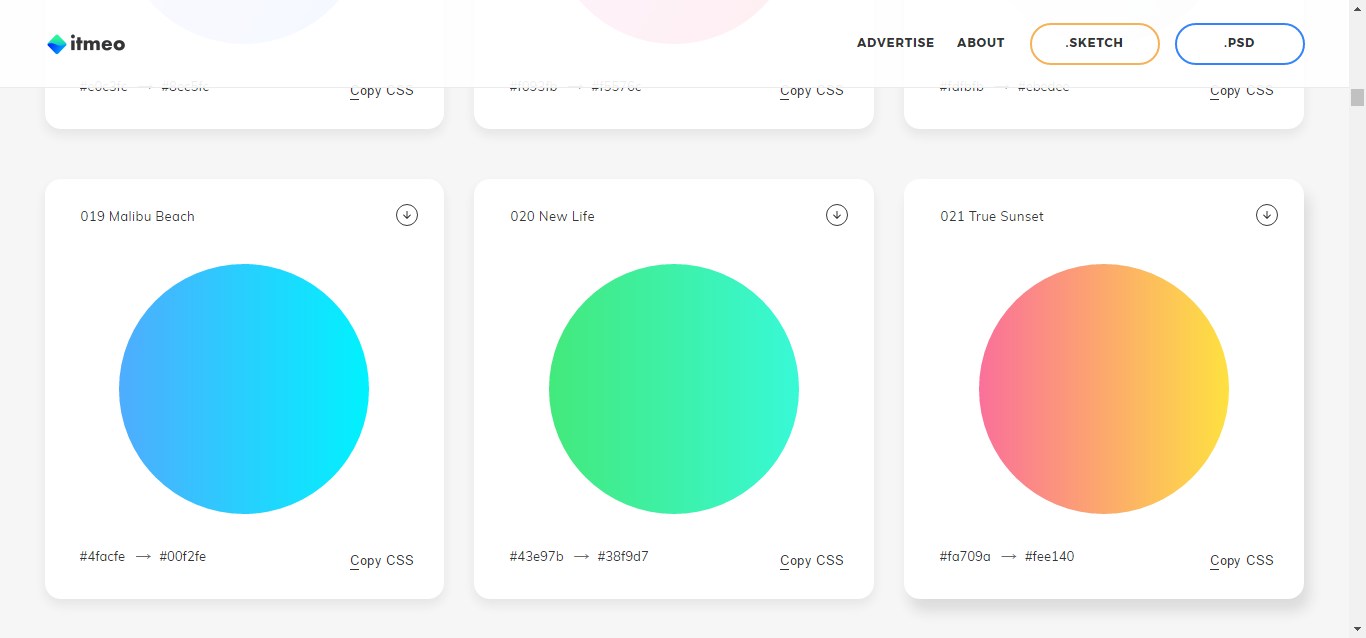 这是一个提供多样渐变种类的网站,所使用的渐变形式为线性渐变。如果是做前端的朋友,可以直接使用拷贝CSS选项,提供了180种渐变形式。如果对于渐变颜色的把握不准,这不失为一个好的颜色搭配的参考。