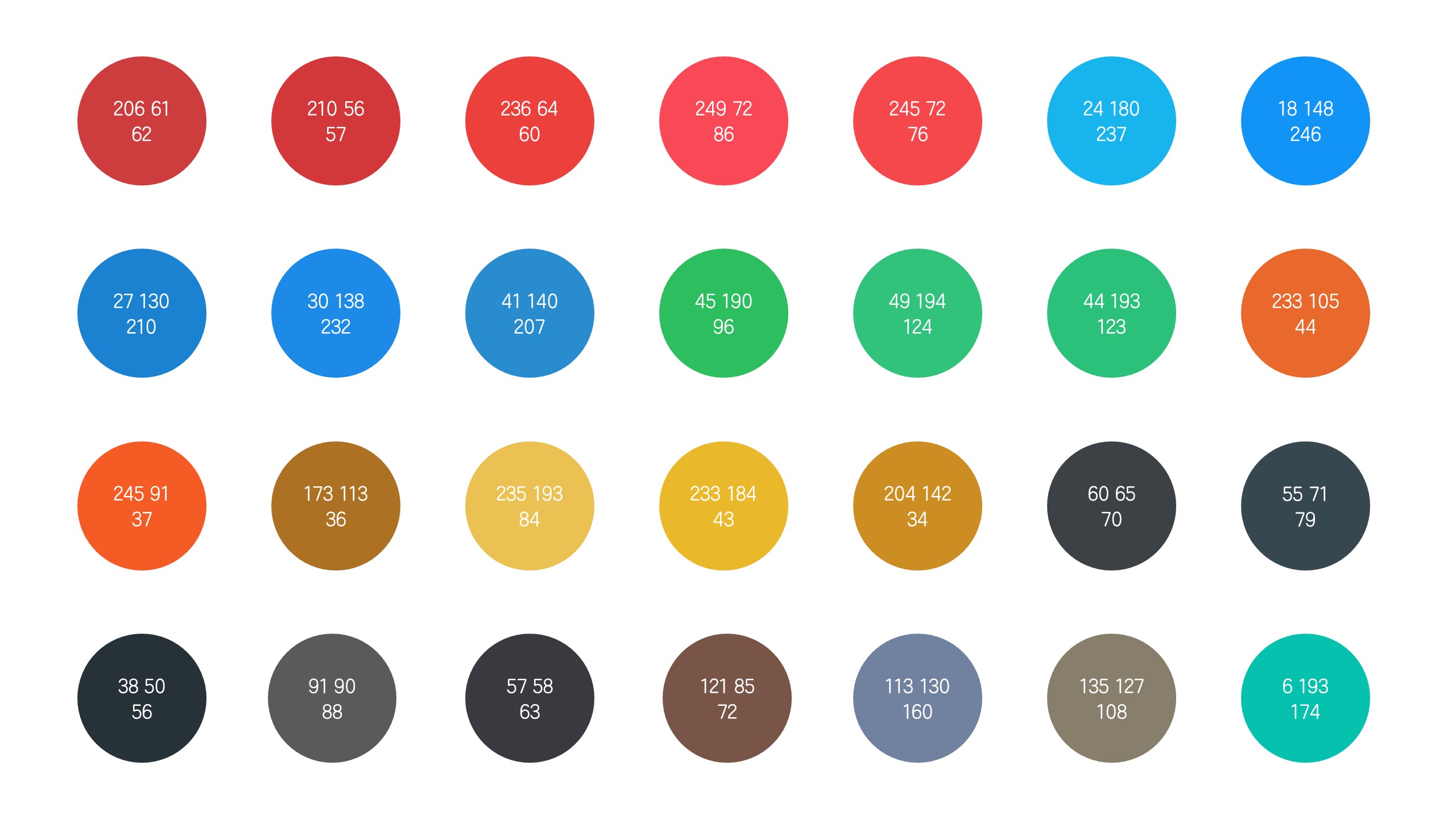 下面这张图中的颜色在本人最近制作幻灯片之中使用较多的一些颜色,涵盖了红橙黄绿蓝紫,深灰、褐色、蓝灰等颜色,每种颜色上面标注的数值为其RGB值。