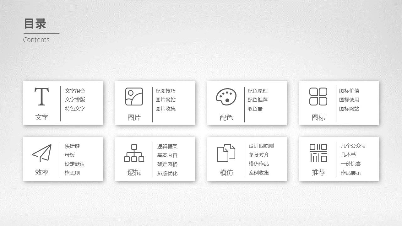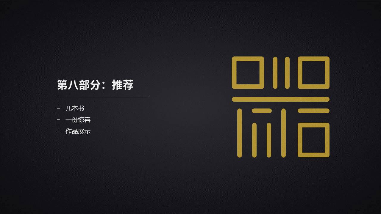 除了书,多看一些作品,也是很有帮助的。能够帮你内化一些书中的理论知识,所以,推荐一些常见的幻灯片类型: