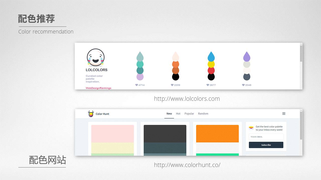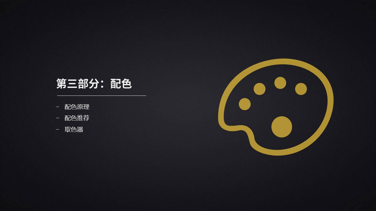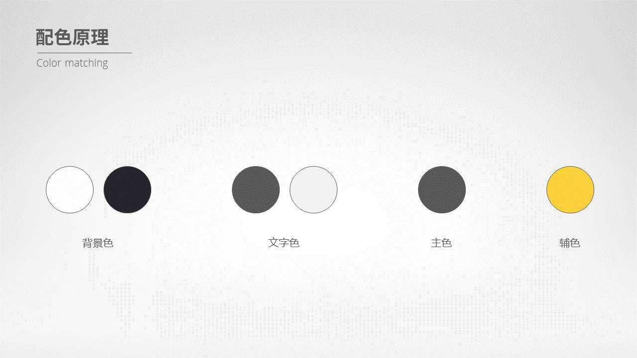 文字和背景色,非黑即白。尽量不要使用彩色。因此,对于配色而言,我们需要选择的,往往是一个贯穿始终的主色和若干个与之搭配的辅助色。