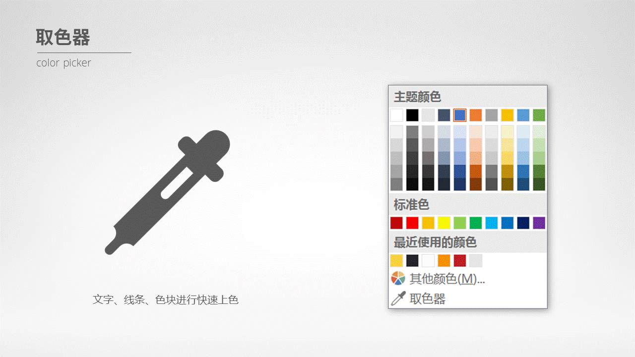 另外,在这里,再去补充一个关于配色的小功能,叫做取色器。如果你想使用前两种方法进行配色,那么,你可以使用这个小功能,进行色彩的提取。