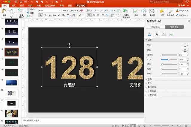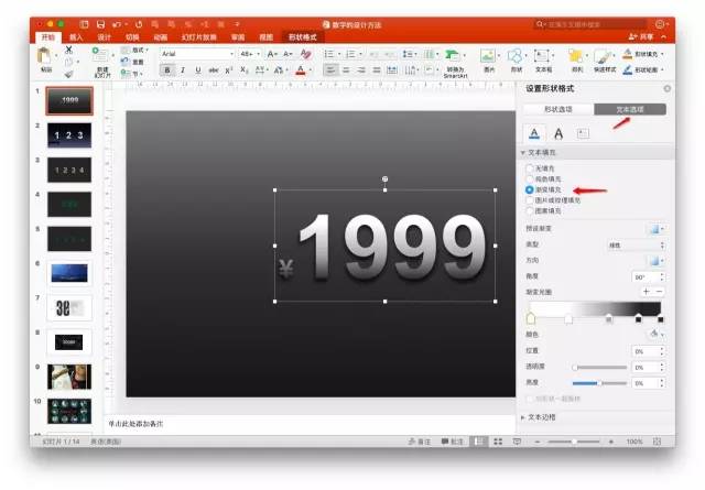 比如上面这个案例就是用白色和灰色的渐变填充,设置上也比较简单,只需要选中文本,设置形状格式,然后选文本选项,而不是形状选项,最后设置一下文本渐变填充的方式。