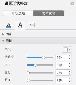 映像效果的设置主要有四个选项,透明度、大小、虚化和距离。