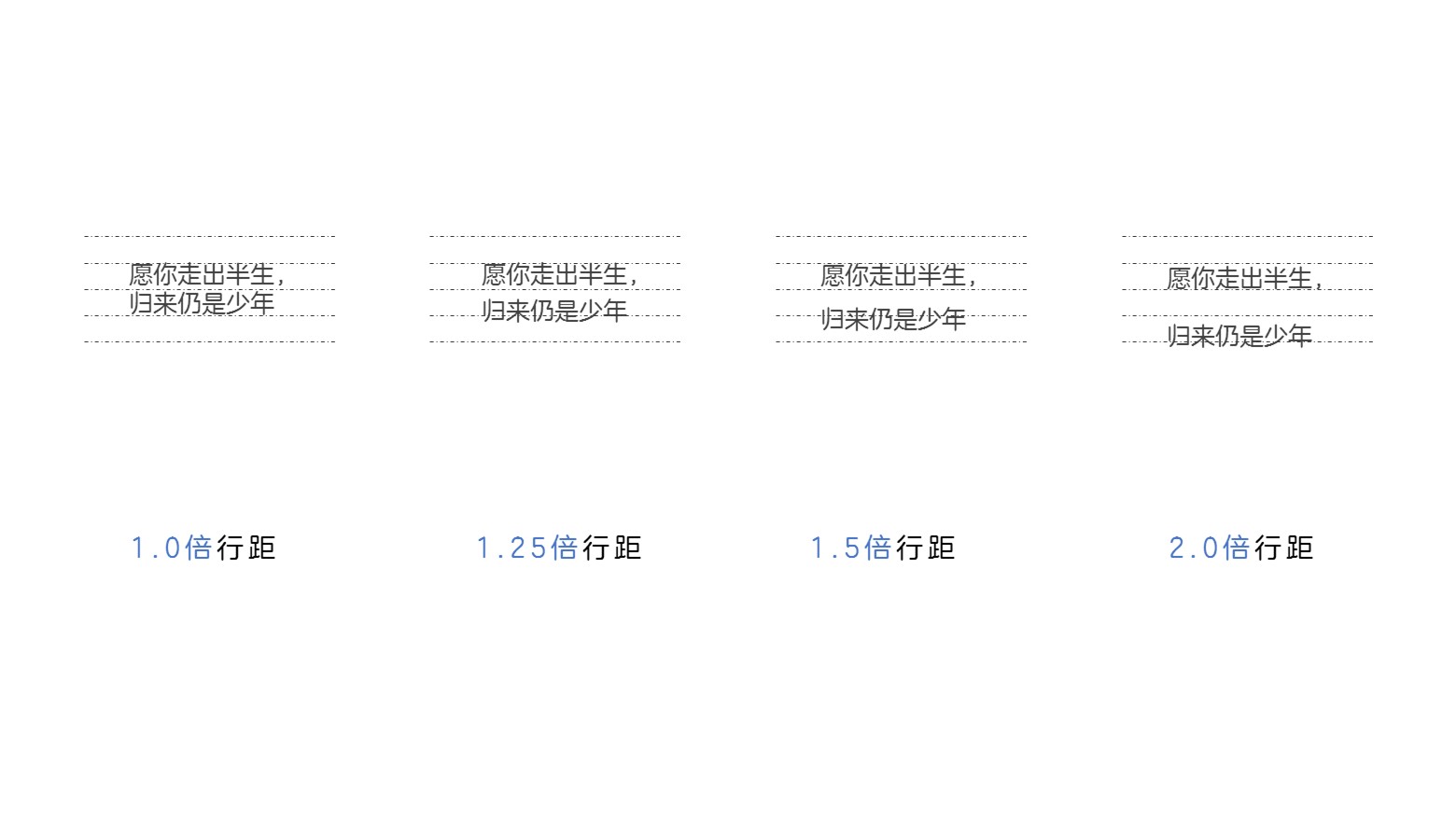 行间距的设置对于大段的文字展示置为重要,在段落行间距设置中,常用的包括以下4种方式,1.0、1.25、1.5、2.0。