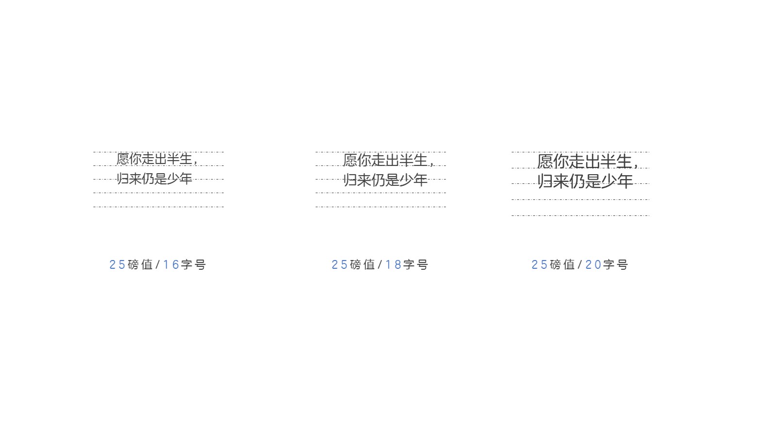 下图之中,均是1.5倍行距18字号,随着字号的增加,行间距的距离随着字号比例增加而等比例增加,这时候将下图中的第三个示例的参考线等比例放大,就可以看出1和3所处位置随着字号增加,保持行间距相同的情况下,展示的效果只是文本的大小而不影响文本段落之间的间距空间。