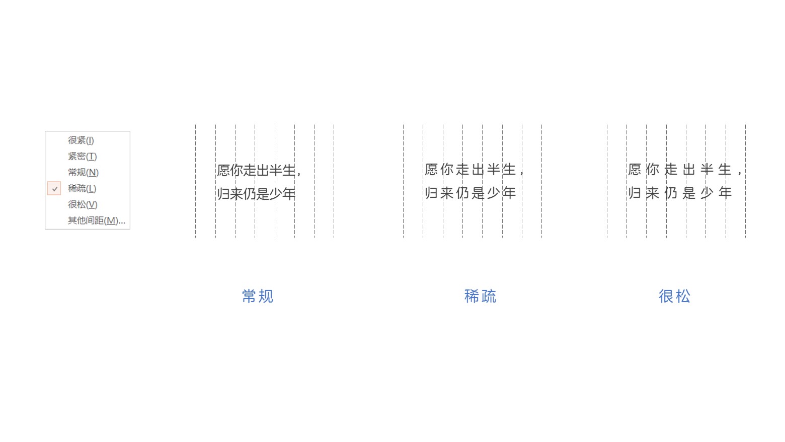 行间距设置是对于段落行与行之间的空白生效的,而对于同一行的文本内容,字和字之间的空白距离对于展示效果也是比较重要的。默认的效果包括:很紧、紧密、常规、稀疏、很松 5种效果。在实际的运用之中,常规、稀疏效果使用较多。