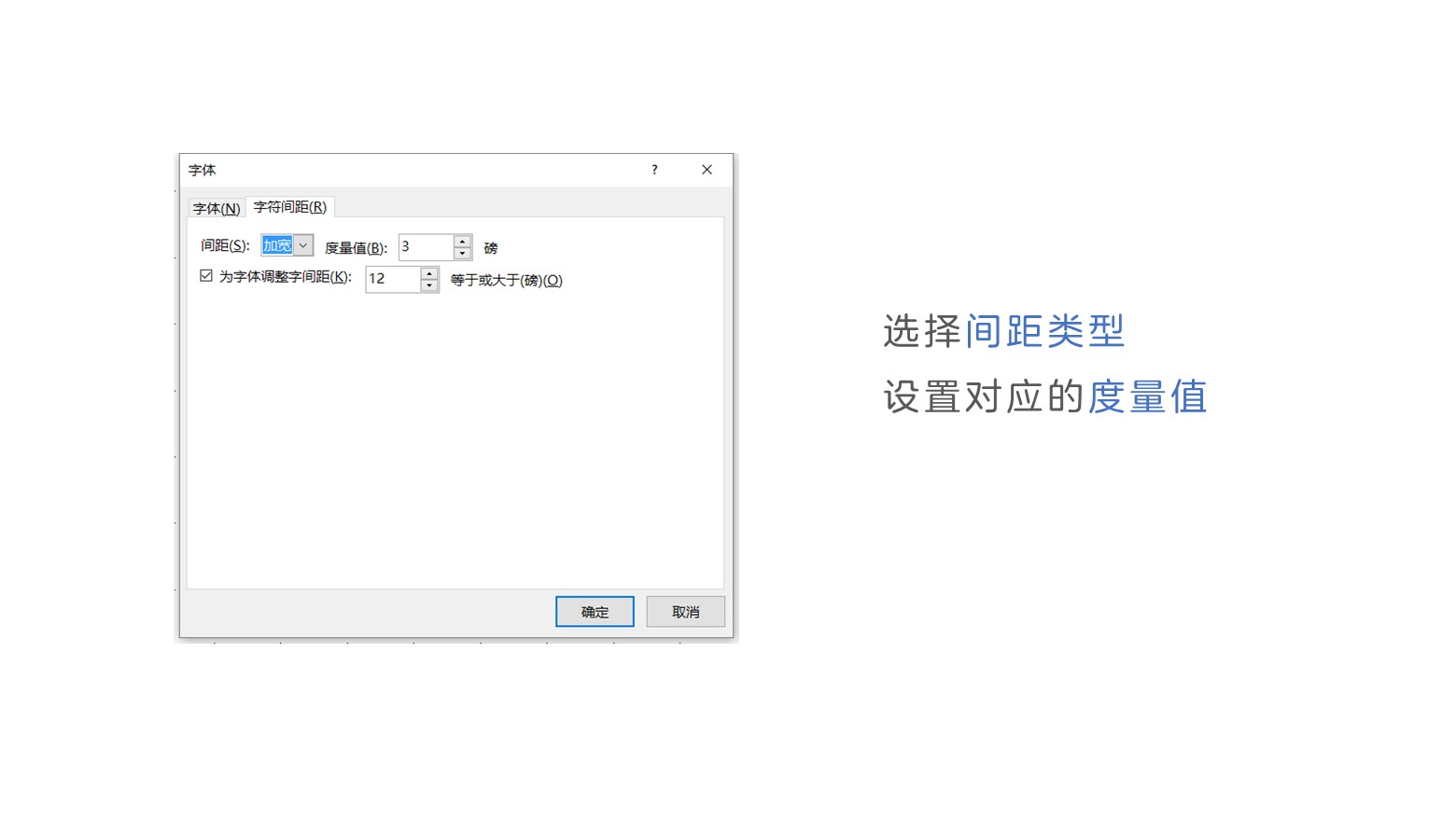 当然,字间距也是可以通过自定义来实现想要的字间隔的效果。通过选择间距类型,然后对应设置度量值即可,数值越大其字和字之间距离也就越大。