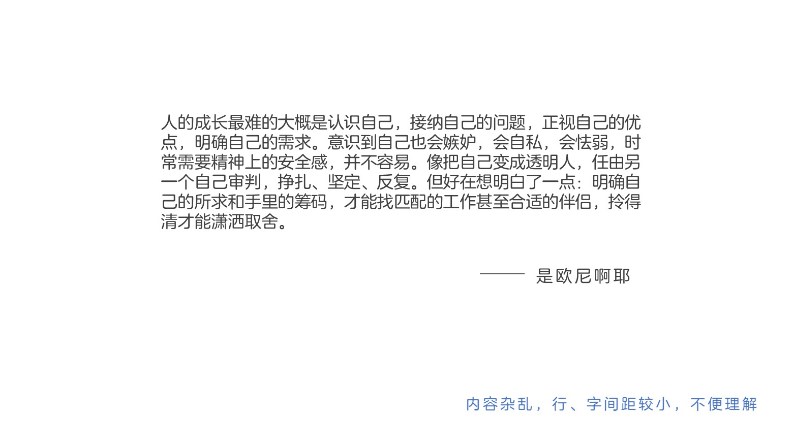 因此,合理控制行长度,减少文本内容在版面横向的空间,这样减少了观众阅读每一行文本内容的难度,下面的两张图中,一个是行长度较大,另一个是经过合理化之后的行长度。