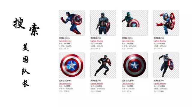 比如我们搜索美国队长,我们就可以搜到很多关于美国队长的PNG图片。