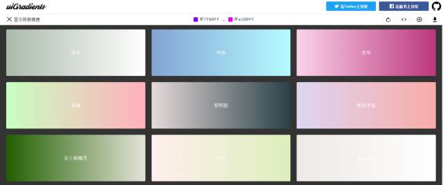 这个网站收录了非常多的渐变色彩,大概有 180 种,都非常的美观。点击一下就色彩就可以大图预览,喜欢的话可以下载 png 图片,很方便。