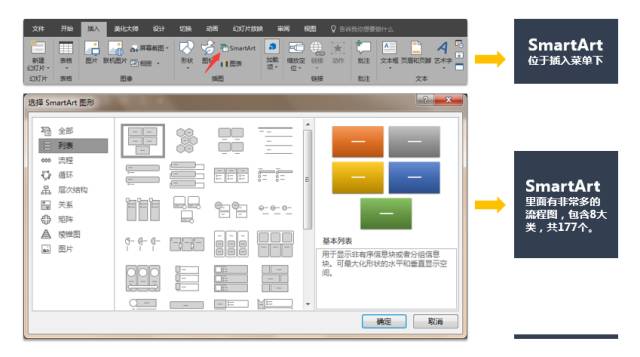 插入方法很简单,直接在插入菜单栏下,选择【SmartArt】,就可以跳出一个窗口,我们选择想要的图表类型就可以了,总共有8类,177个图表。