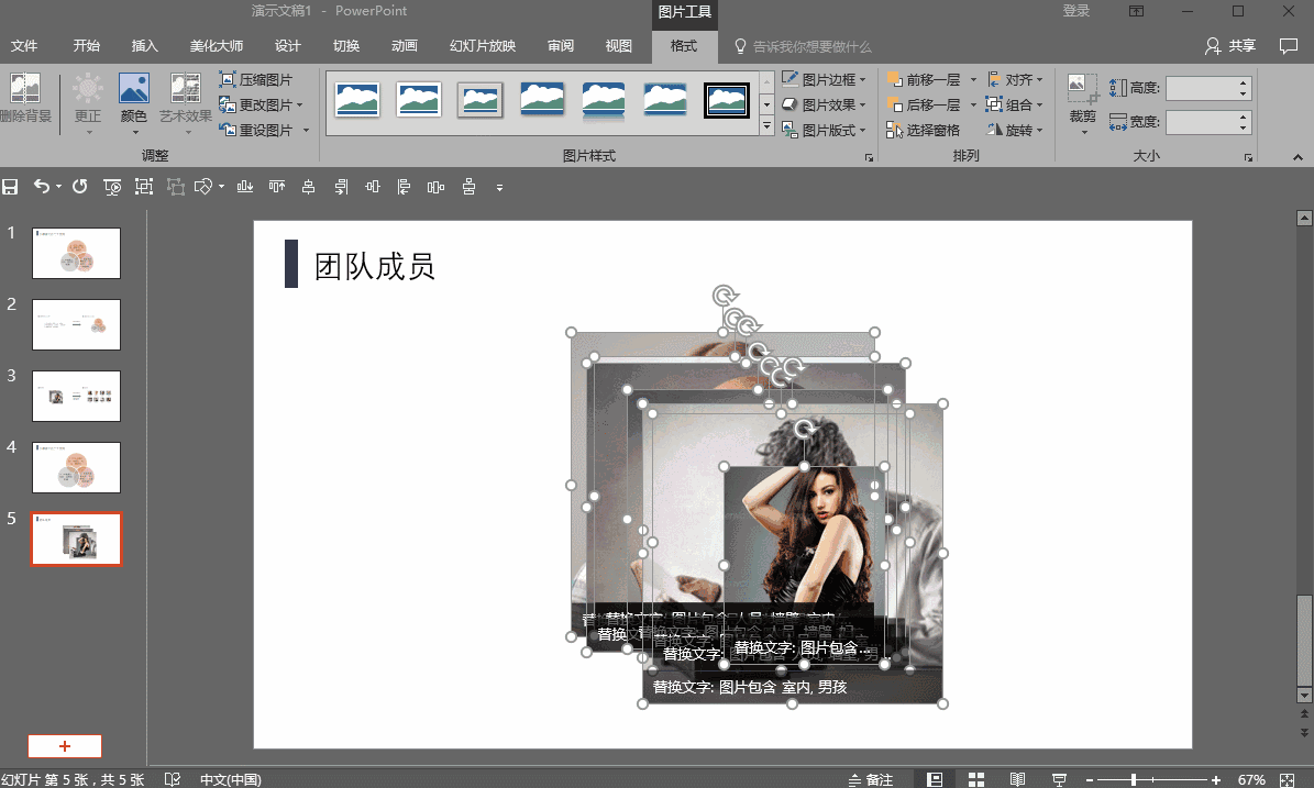 具体的操作,也非常简单,直接全选所有图片,然后找到【格式】菜单,这里要用到【图片版式】这个选项,里面有很多图片排版的类型。