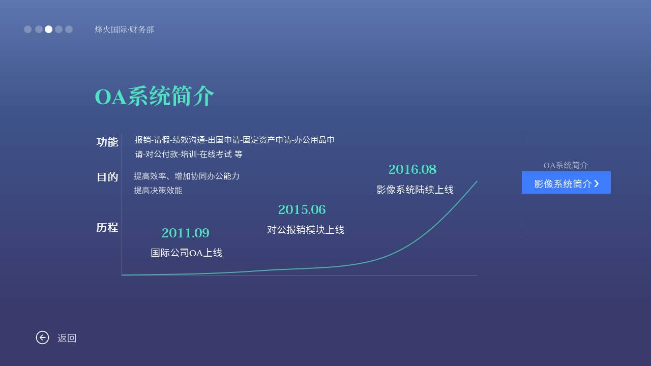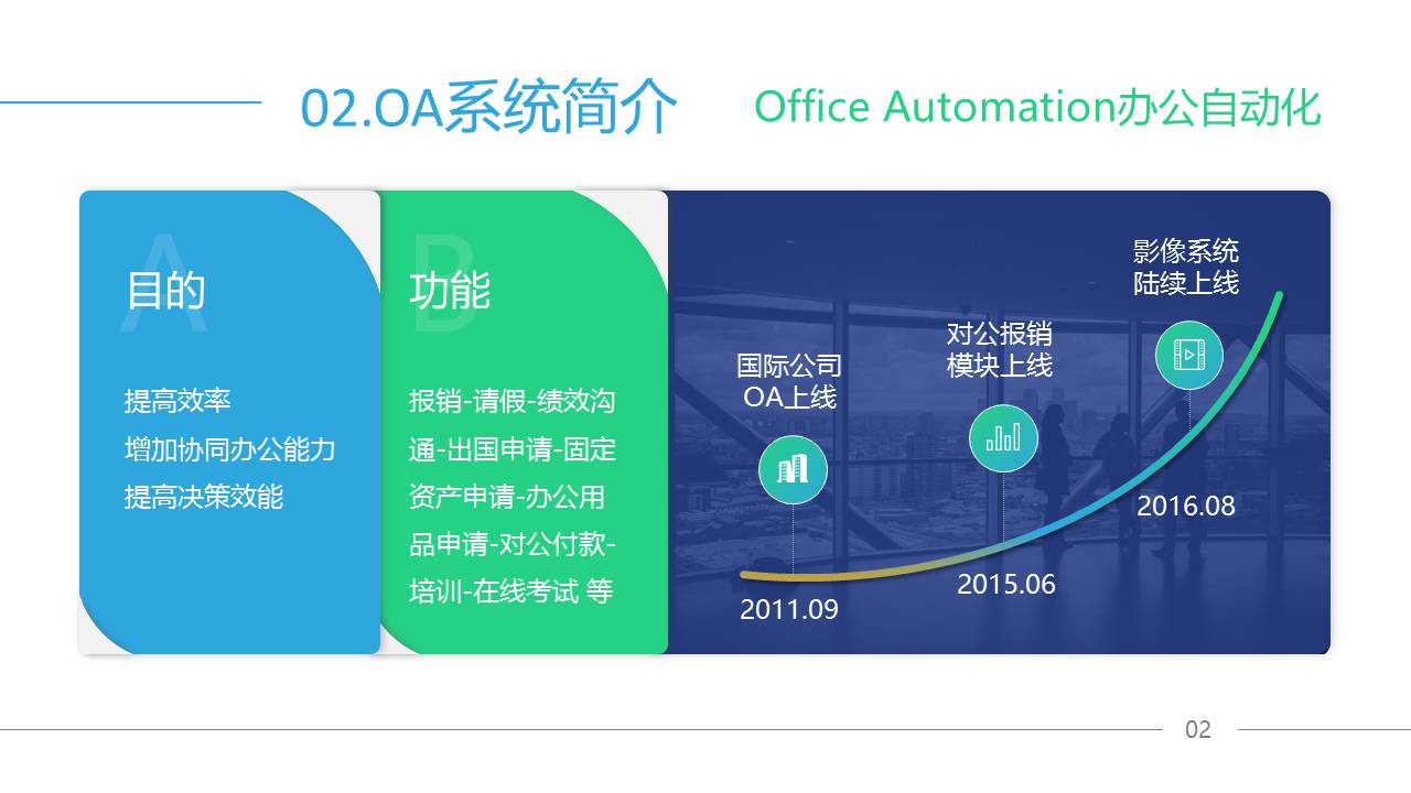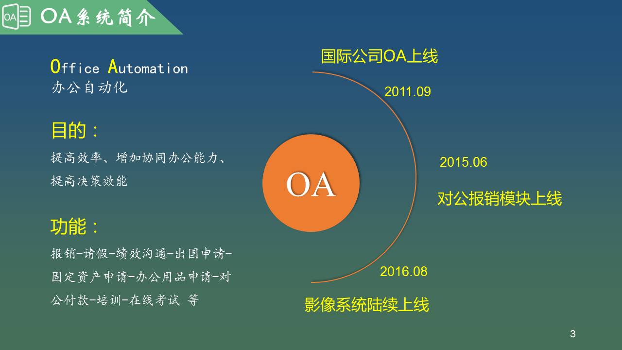 此页原稿在内容描述上已经够清晰 ,分别说明了OA系统的目的功能和时间线。基于颜色和排版的美化,再重新做了一版。